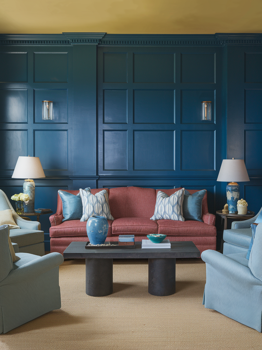 Wainscoting adds architectural detail and texture while bold paint colors bring personality and drama. Install traditional or modern panel molding and paint the entire wall in a rich shade such as deep blue, forest green, or warm terracotta. The combination of structure and color creates depth and a polished, designer look. This accent wall works beautifully in both classic and contemporary living rooms, depending on the molding style. Pair it with neutral furniture and soft lighting to balance the bold tone. The paneling also helps the wall feel more substantial and visually interesting. This idea offers a playful yet refined way to introduce color while enhancing the overall sophistication of your living space.