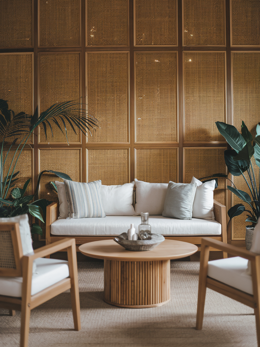 Cane or rattan panels bring natural texture and warmth to your living room, creating a relaxed and stylish accent wall. The woven pattern adds visual detail while maintaining a light and airy feel. This design works especially well in boho, coastal, or modern organic interiors. Install panels in sections or across an entire wall to create a cohesive feature behind a sofa or media unit. Pair the wall with wood furniture, neutral textiles, and indoor plants to enhance the natural aesthetic. Soft lighting will highlight the texture and create a cozy atmosphere. A cane or rattan accent wall is perfect for adding a playful yet calming element that feels both trendy and timeless.