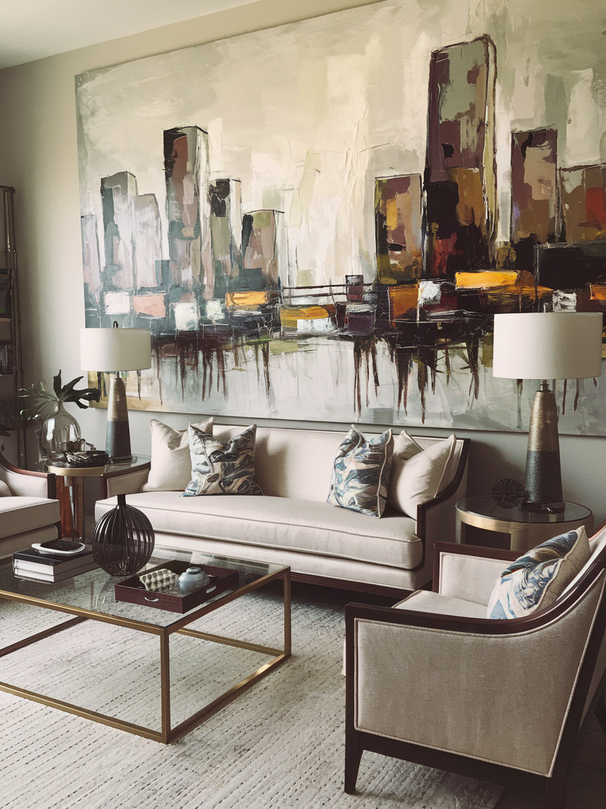 Sometimes a single oversized artwork is all you need to create a powerful accent wall. Choose a large painting, photography piece, or framed print that reflects your style and color palette. The scale immediately draws attention and anchors the living room without the need for multiple decorative elements. Keep the surrounding wall simple and uncluttered so the artwork becomes the focal point. Pair it with minimal decor and cohesive furniture tones to maintain balance. Proper lighting, such as picture lights or directional lamps, will enhance the visual impact. A statement art wall is a playful yet sophisticated way to add personality, color, and artistic presence while keeping the overall design clean and stylish.