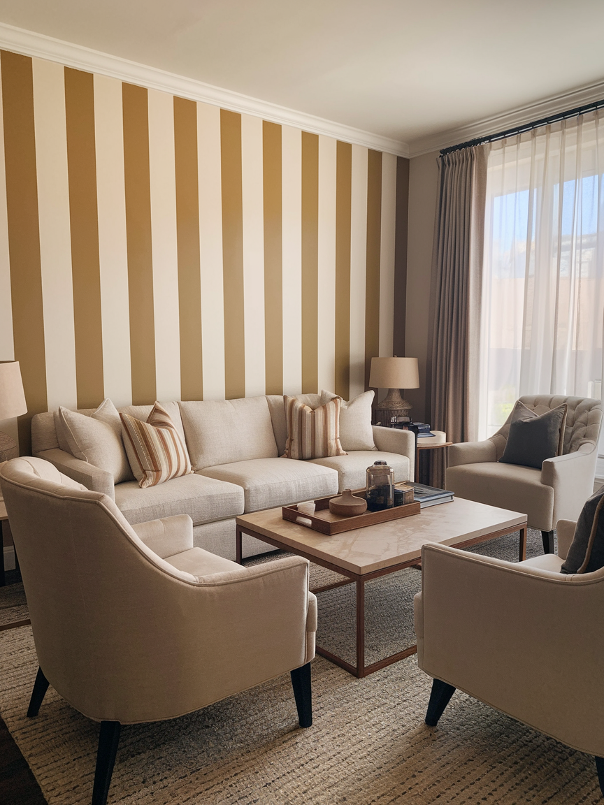 Vertical stripes are a timeless yet playful way to add height and rhythm to your living room. Alternating wide stripes in soft neutrals or subtle color contrasts can make ceilings appear taller, and the space feel more open. For a more energetic look, try combining bold shades like mustard and white or deep green with warm beige. Painted stripes create a clean, tailored appearance that works well in both modern and classic interiors. This design is especially effective in smaller living rooms where visual height makes a big difference. Pair the wall with simple furniture and layered textures such as woven throws or linen curtains to soften the structured lines. Vertical stripes add visual interest without overwhelming the room, making them a versatile option for homeowners who want a playful design that still feels polished and timeless.