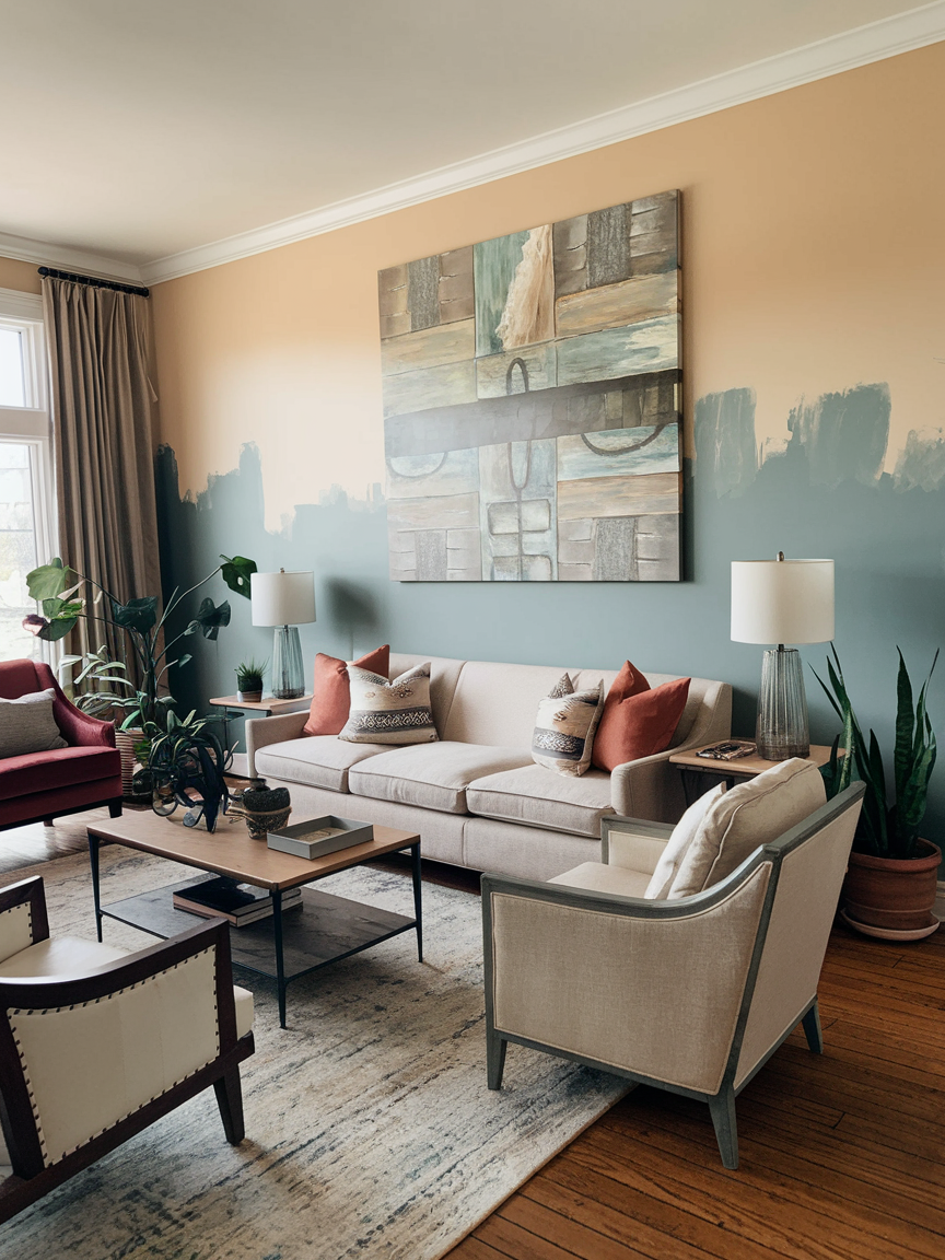 A half-painted wall offers a subtle yet stylish way to introduce color without overwhelming the space. By painting only the lower or upper portion of the wall, you create a modern layered effect that adds depth and character. This design works beautifully with earthy tones, muted pastels, or bold contrasting colors, depending on your desired mood. The horizontal division also helps visually anchor furniture like sofas or consoles, making the room feel more balanced. For a playful twist, choose an unexpected color combination such as olive green with warm cream or dusty blue paired with soft peach. Add artwork or wall decor above the painted section to enhance the layered look. This approach is perfect for creating a fun accent wall that feels contemporary, elegant, and easy to refresh over time.