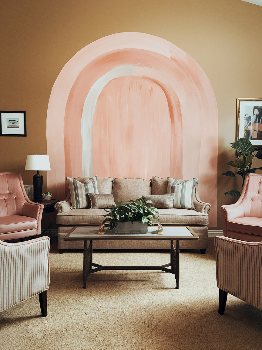 A painted arch creates a soft, artistic focal point that adds a playful and modern touch to your living room. The curved shape contrasts beautifully with straight furniture lines, bringing a sense of flow and visual interest to the space. Use earthy tones, warm neutrals, or muted pastels to keep the design stylish and versatile. This accent works especially well behind a sofa, reading chair, or console table, naturally framing the area. The arch can also make ceilings feel higher, and corners appear more intentional. Pair it with simple decor and layered textures for a balanced look. This idea is perfect for homeowners who want a creative accent wall that feels trendy, approachable, and easy to personalize.