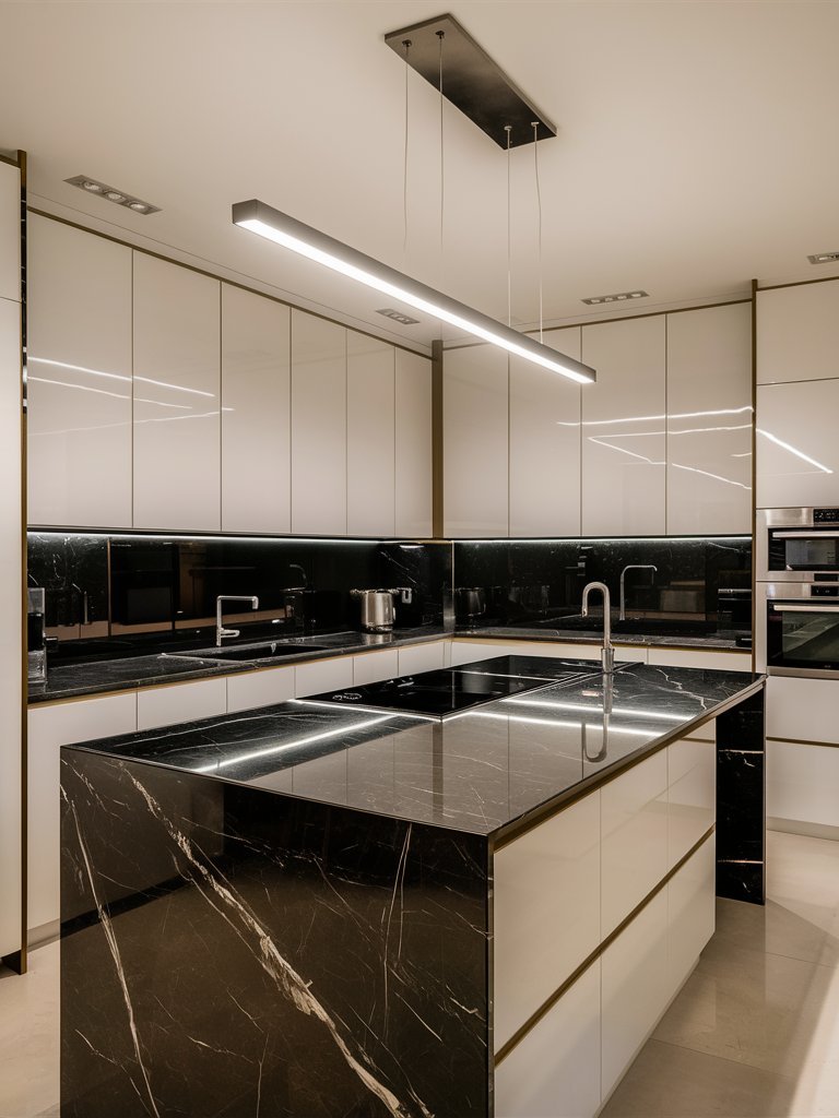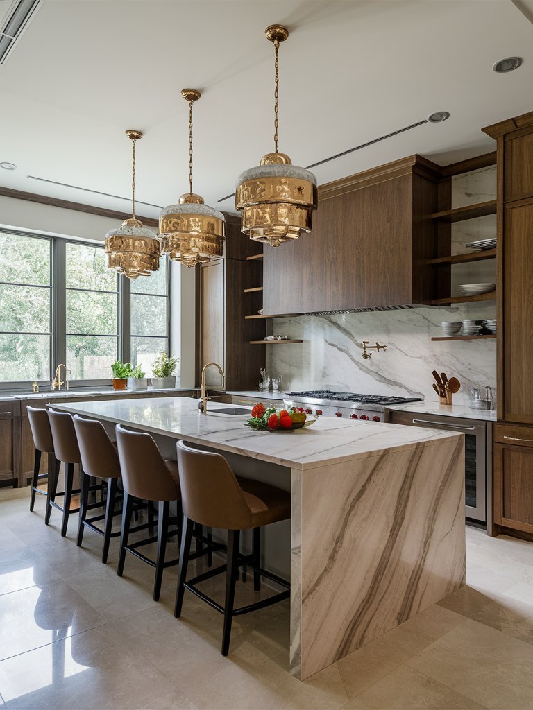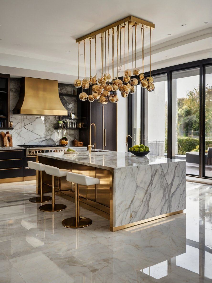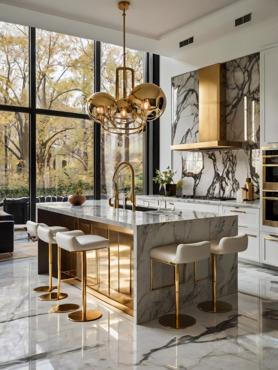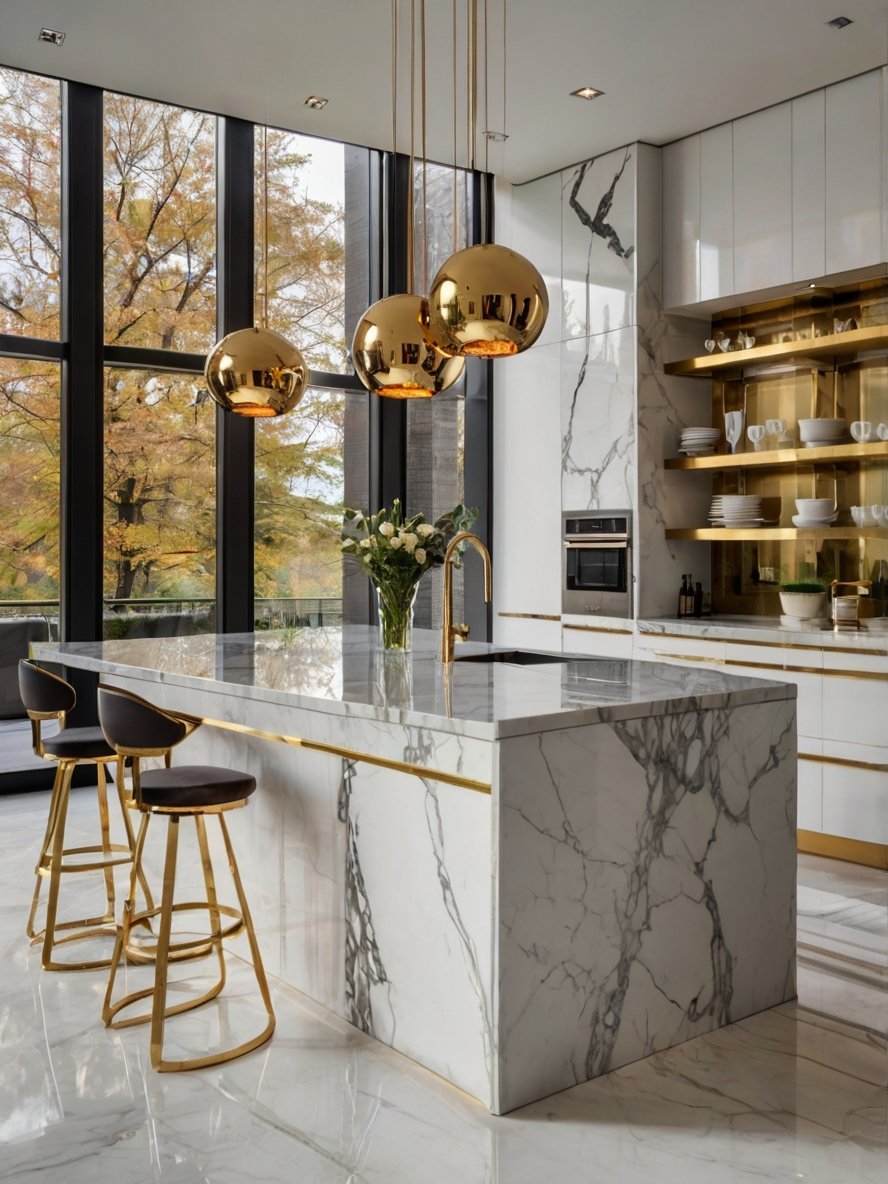 The extensive use of marble in this kitchen is a bold design statement that instantly elevates the space. The intricate veining of the marble on the countertops, backsplash, and even the flooring introduces a natural elegance that feels both contemporary and timeless. The choice of white marble with dramatic black and gray veining creates visual interest and adds depth to the overall aesthetic. This luxurious material not only highlights the room’s sophistication but also offers durability and practicality for everyday use. The sheer scale and placement of the marble make it a focal point that harmoniously complements the gold accents, solidifying the kitchen’s identity as a modern masterpiece.