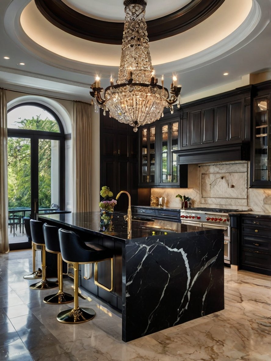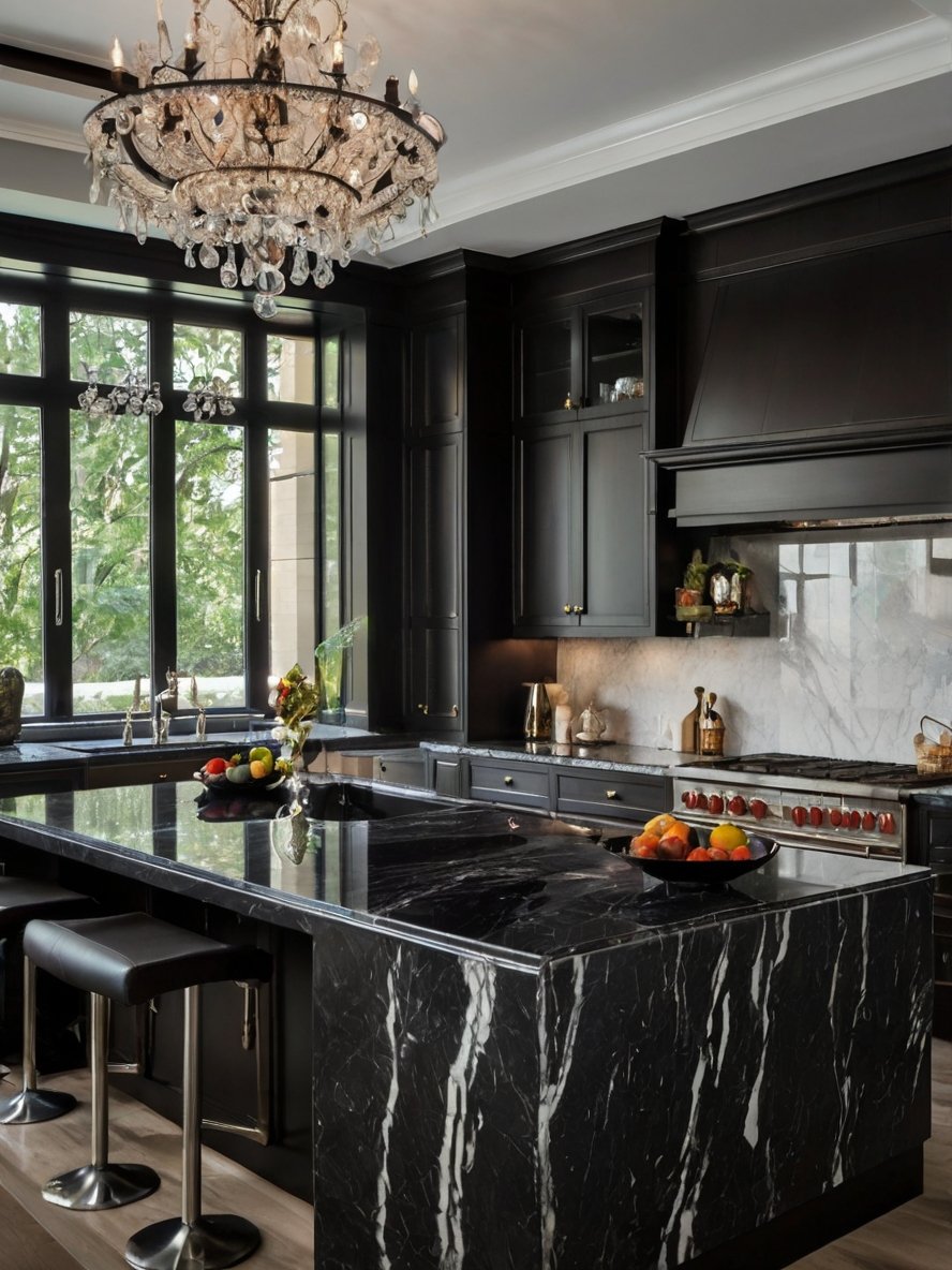 The bold black cabinetry is a defining feature that sets this kitchen apart, exuding sophistication and confidence. The dark finish offers a striking contrast to the lighter tones of the marble backsplash and countertop. This choice creates depth and drama while maintaining an elegant balance. The intricate detailing on the cabinets adds a timeless charm, blending modern luxury with traditional craftsmanship. The black finish also ensures durability and is a versatile backdrop for accent colors and decor.