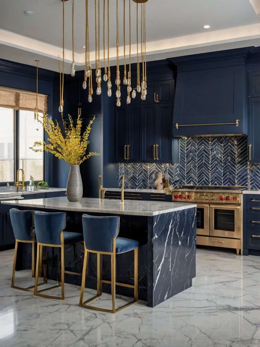 The deep navy blue cabinetry paired with gold accents creates a bold and luxurious color palette in this kitchen. The gold highlights, seen in the cabinet hardware, faucet, and chandelier, add warmth and elegance, contrasting beautifully with the cool tones of the blue. This sophisticated combination not only makes a striking visual statement but also exudes a timeless quality. The cohesive use of blue and gold across the entire kitchen ties the design together, ensuring every element feels intentional and harmonious.