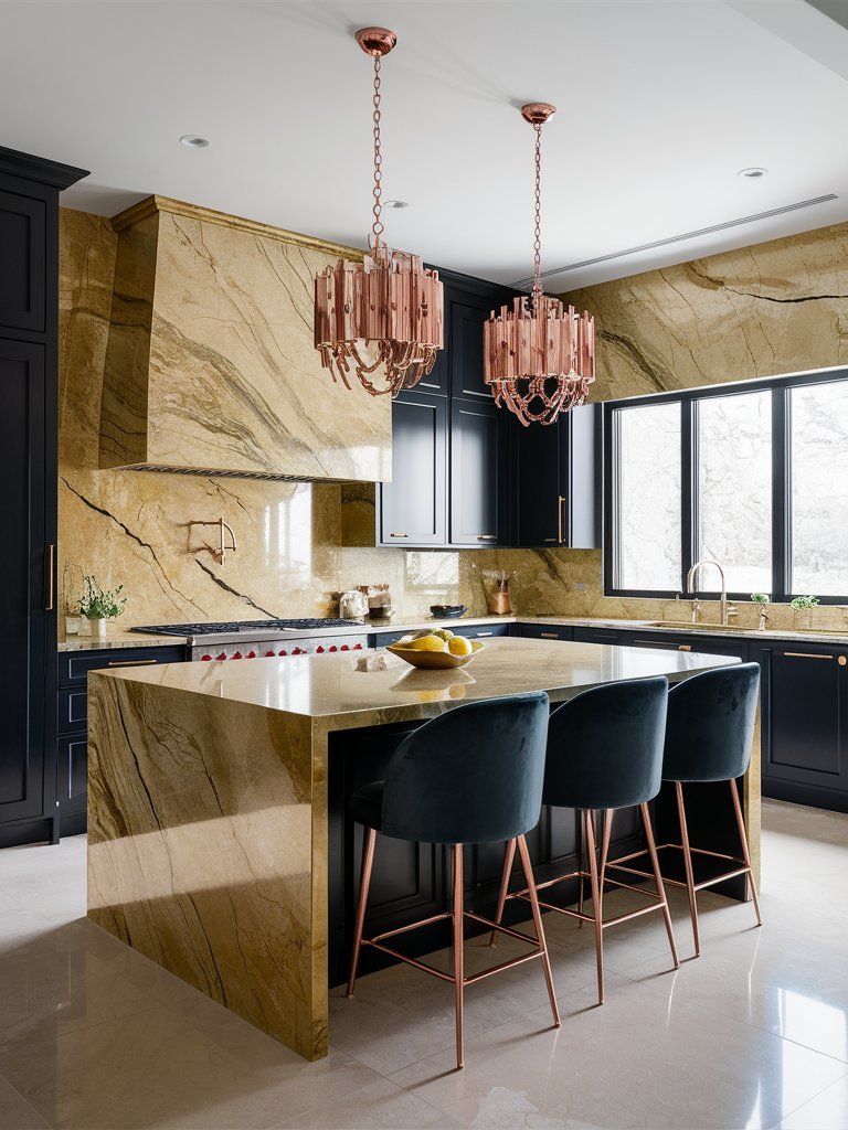 The defining feature of this kitchen is undoubtedly the stunning golden marble that envelopes the island, backsplash, and vent hood. Its organic veining creates a visual flow that evokes a sense of grandeur and sophistication. The golden hues reflect the natural light streaming in through the windows, further enhancing the luxurious ambiance. This choice of material elevates the space, making it feel both opulent and contemporary. The consistency of the marble across surfaces ensures a cohesive and seamless design that’s breathtaking in its simplicity yet rich in detail.