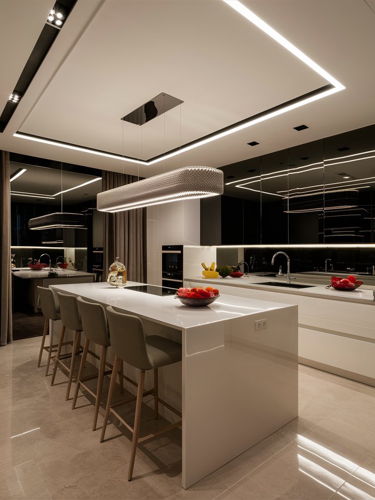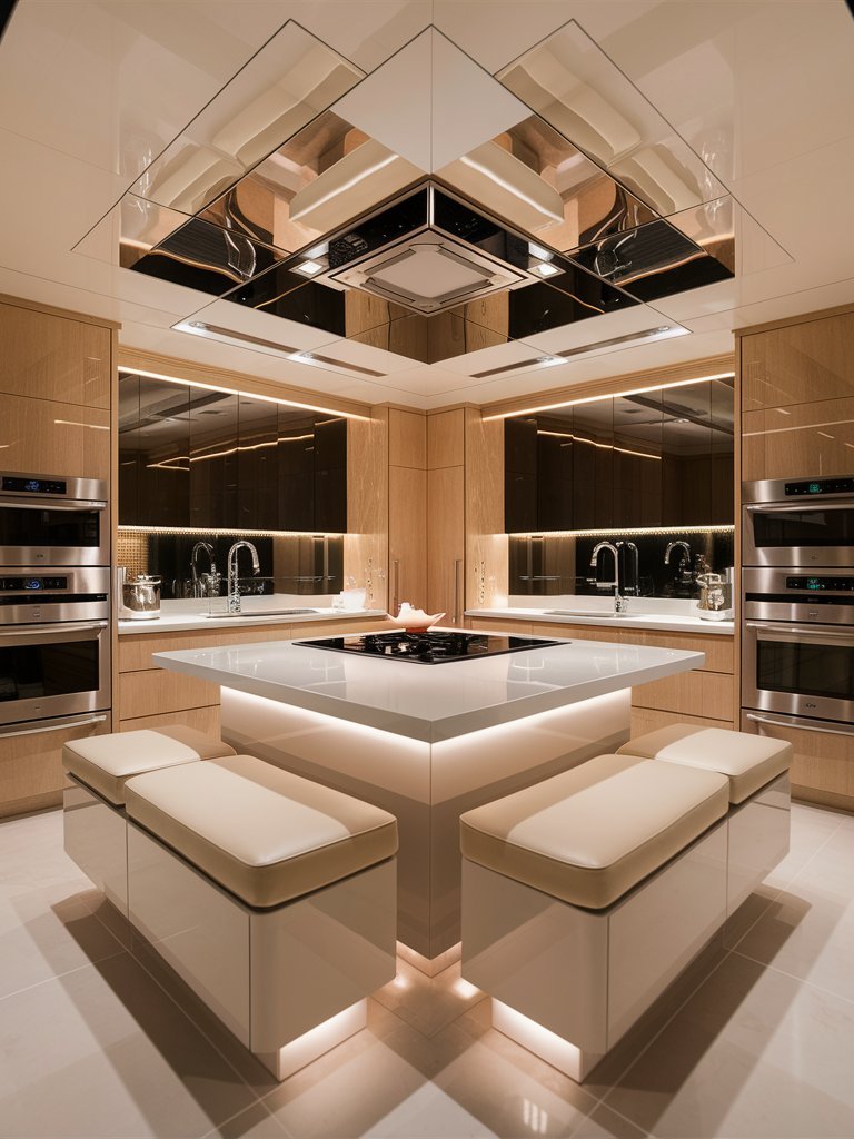 The centerpiece of this luxurious kitchen is its illuminated center island, which exudes modern sophistication. The island’s soft LED lighting enhances its sleek and minimalistic design, creating a glowing focal point that sets the tone for the entire space. The glossy white surface reflects light beautifully, amplifying the kitchen’s ambiance while providing a clean and expansive workspace. Integrated seating around the island adds versatility, transforming it into a hub for casual dining or socializing. This feature perfectly balances form and function, making it an ideal addition for a contemporary, high-end kitchen.