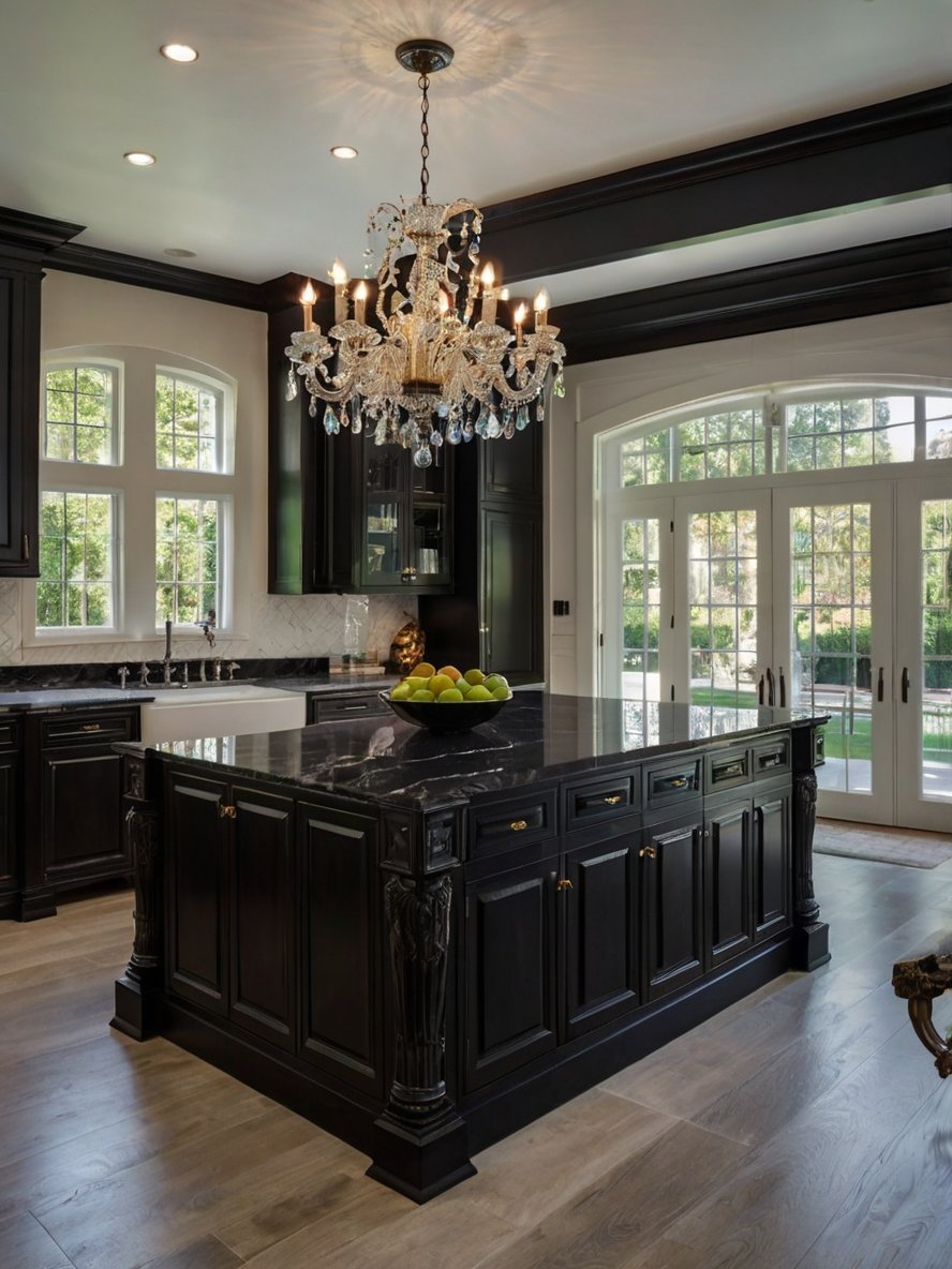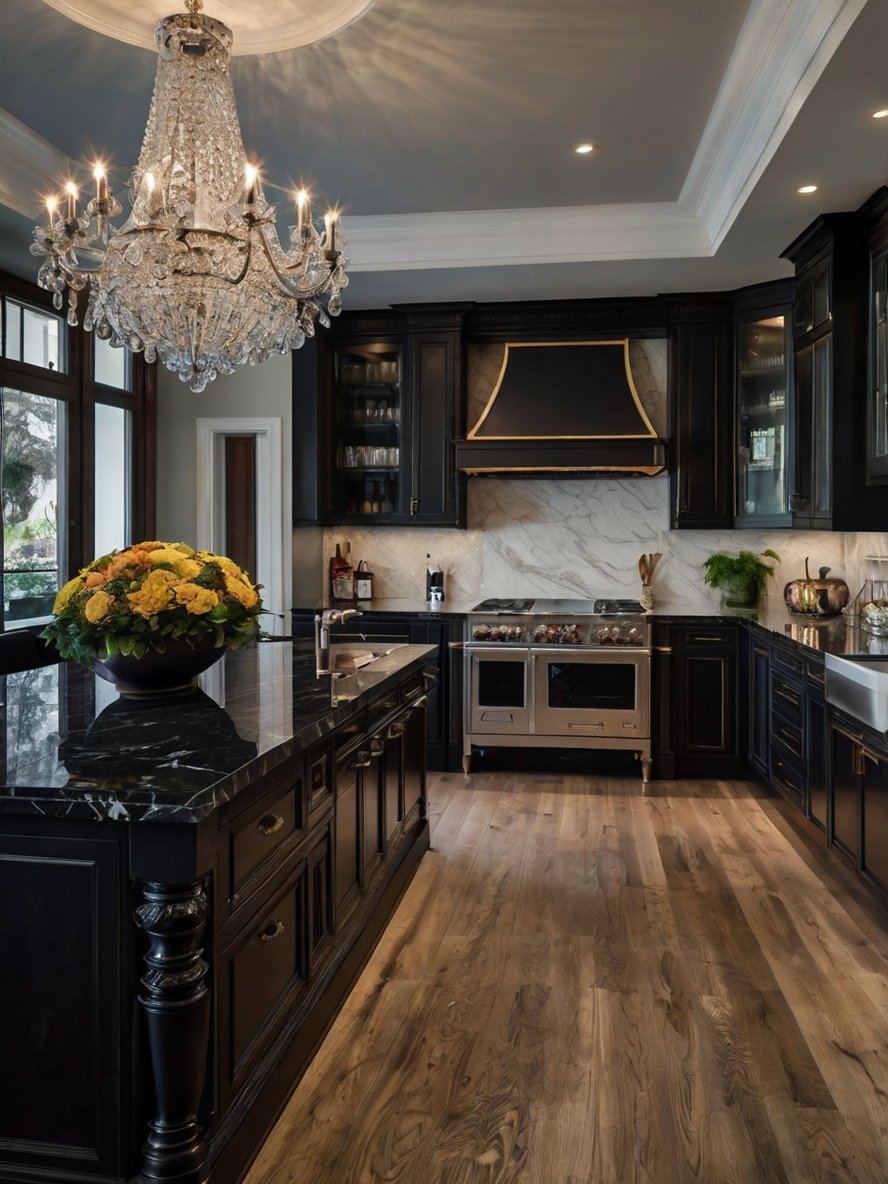 The black and gold color scheme is a masterclass in timeless luxury. The black cabinetry, paired with gleaming gold hardware, creates a striking visual contrast that feels both bold and refined. The gold accents—seen on drawer pulls, faucets, and even light fixtures—add warmth and a touch of glamour, preventing the space from feeling too austere. This classic pairing ensures that the kitchen remains stylish and relevant for years to come, proving that great design is truly timeless.
