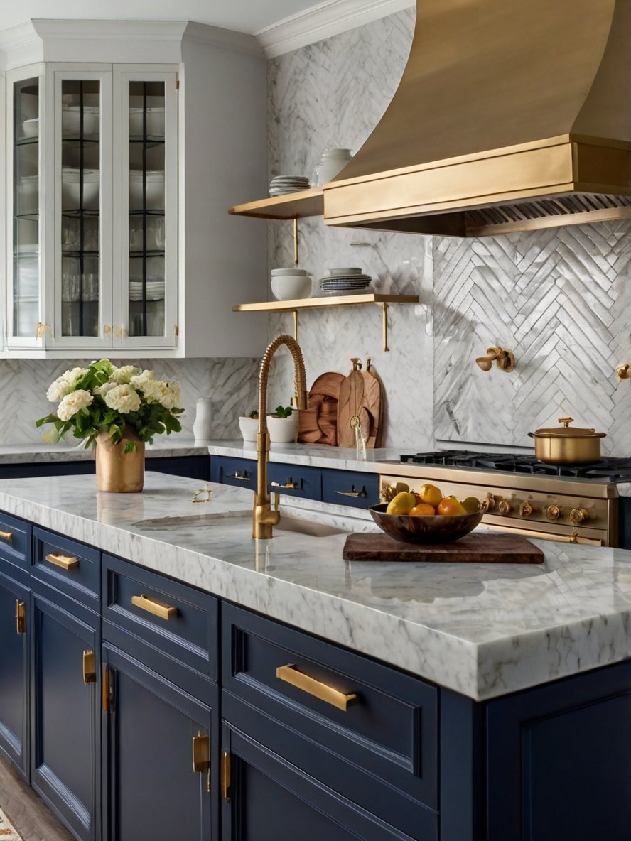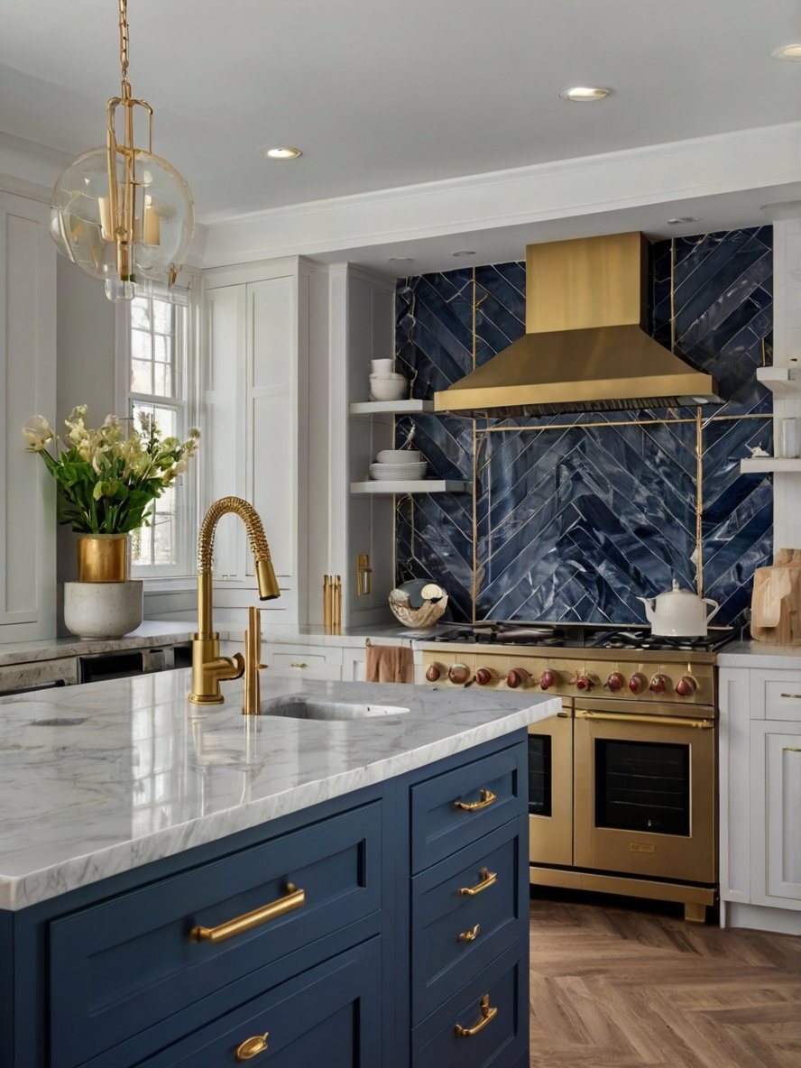The rich navy blue backsplash arranged in a striking herringbone pattern becomes the immediate focal point of this luxurious kitchen. The depth and texture of the blue tiles exude elegance, making the space feel both bold and sophisticated. The subtle gloss of the tiles adds a touch of shine, enhancing the light reflection and adding dimension to the space. The use of gold accents within the grout lines further elevates the backsplash, creating a seamless connection to the surrounding gold fixtures and appliances. This combination of colors and patterns exemplifies how daring choices can result in timeless sophistication. Not only is this backsplash aesthetically stunning, but it also balances the room’s lighter cabinetry and countertops, anchoring the design with its dramatic flair.