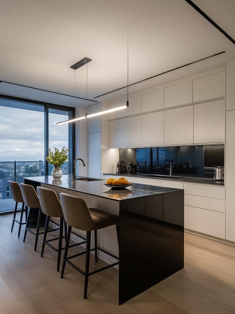 This kitchen embodies the essence of modern minimalism with a sophisticated twist. The seamless combination of matte white cabinetry and a glossy black island creates a stunning monochromatic contrast that speaks of understated luxury. Every element, from the flush cabinetry to the absence of visible hardware, is carefully curated to enhance the sleek aesthetic. The design emphasizes clean lines and simplicity while maintaining a refined and high-end feel. The focus on minimalism ensures that functionality remains a priority without compromising style. This kitchen is a testament to the fact that less is indeed more when executed with precision and attention to detail.