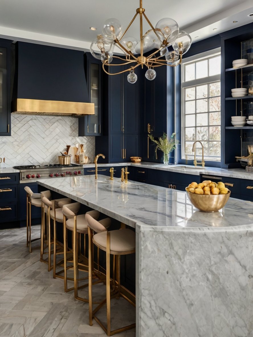 The rich navy blue cabinetry lends a bold sophistication to the kitchen. Its deep hue contrasts perfectly with the lighter marble and brass accents, creating a dynamic visual palette. The matte finish of the cabinets exudes understated luxury while allowing the gold hardware to shine. Beyond its aesthetic appeal, the cabinetry provides abundant storage, keeping the space functional and clutter-free. The use of navy blue as a dominant color showcases a daring design choice that feels modern yet timeless.
