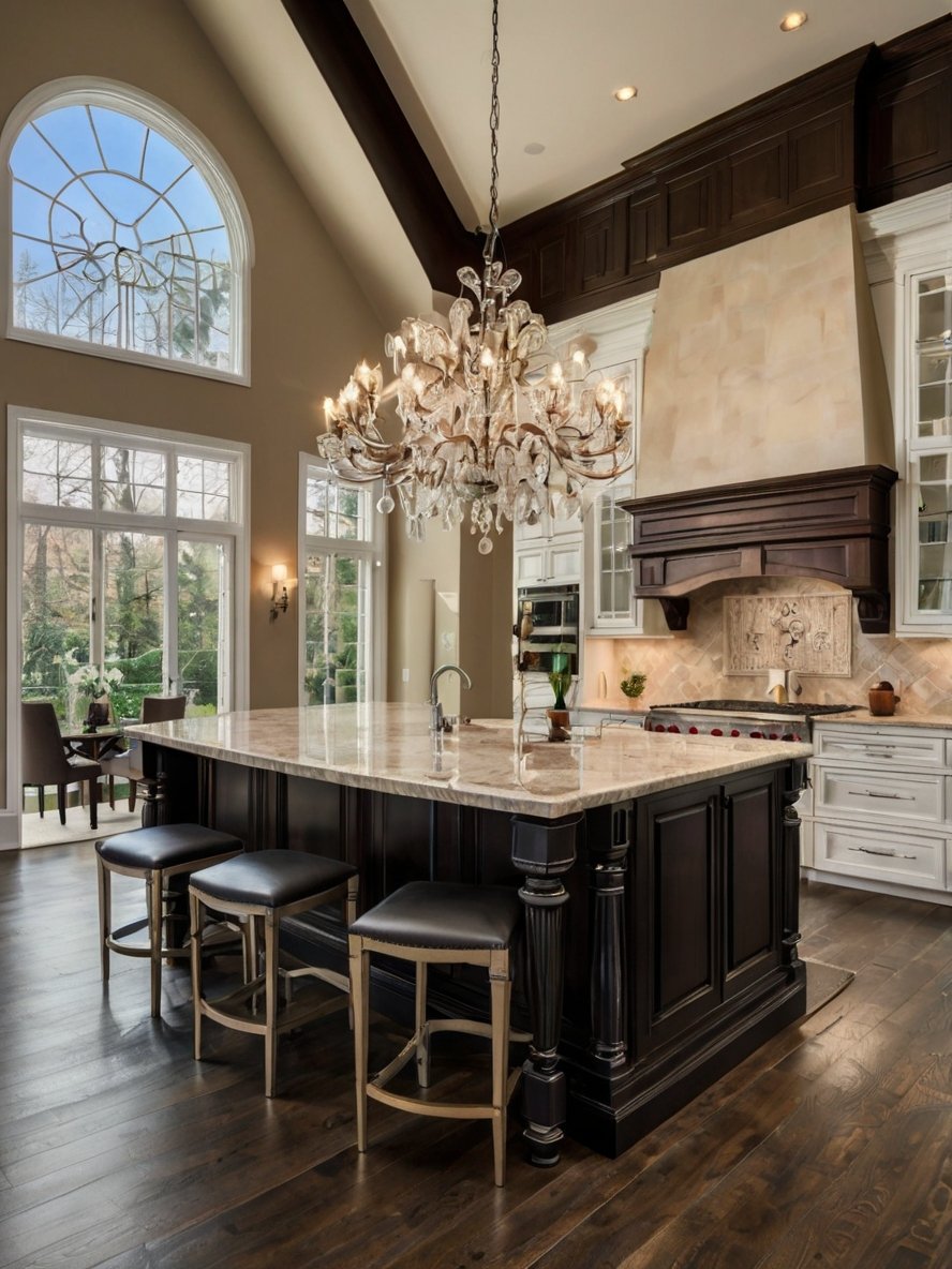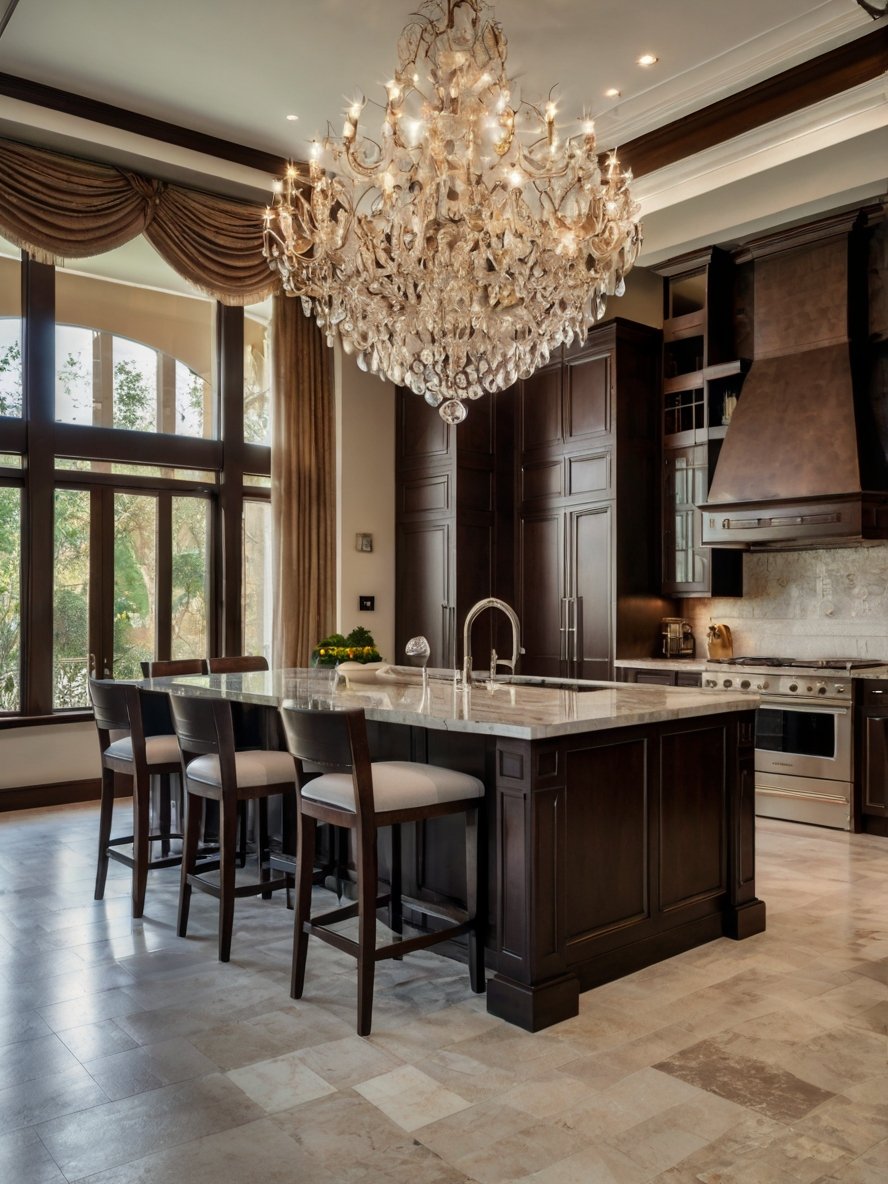 The chandelier in this luxurious kitchen is nothing short of breathtaking, exuding opulence and refinement in every facet of its intricate design. Suspended as the centerpiece of the room, the cascading crystals shimmer in the ambient light, casting a warm, welcoming glow throughout the space. The chandelier’s grand scale complements the lofty ceilings, drawing the eye upward and emphasizing the room’s verticality. Beyond its visual appeal, it enhances the kitchen’s functionality, providing balanced lighting that is both practical and mood-enhancing. The ornate craftsmanship of the chandelier introduces a sense of timeless luxury, seamlessly integrating into the room’s classic-meets-modern aesthetic. This feature alone sets the tone for the space, creating an immediate impression of sophistication and grandeur that transforms a functional kitchen into an extraordinary experience.