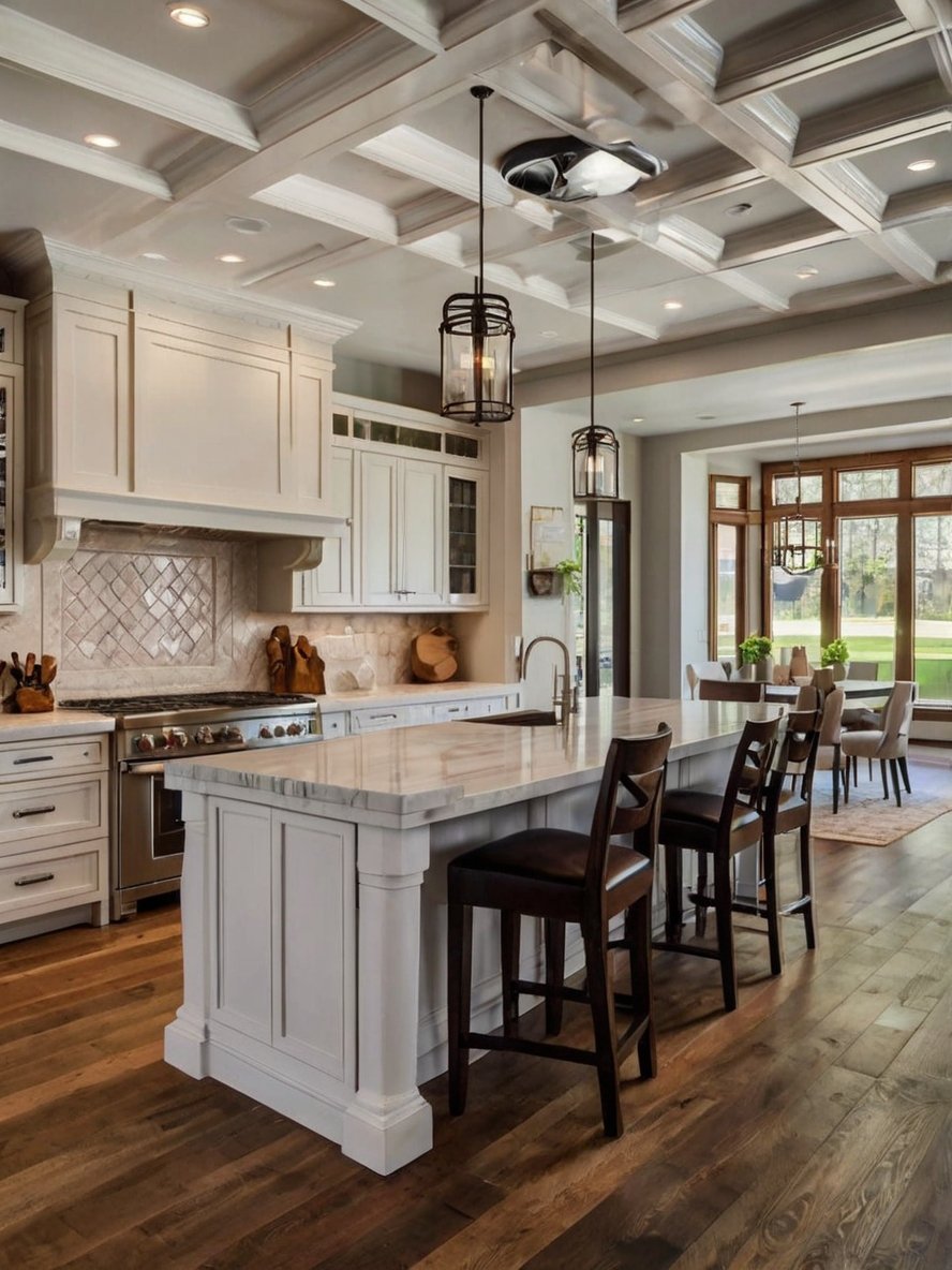 The coffered ceiling in this luxurious kitchen is an architectural masterpiece. Its intricate design adds dimension and depth to the space, creating an air of sophistication. Painted in a pristine white hue, the ceiling reflects natural and artificial light, amplifying the room’s brightness. This feature serves as a decorative element that enhances the overall aesthetic while blending harmoniously with the cabinetry and walls. The coffered ceiling also provides an excellent base for the pendant lighting, ensuring that every design choice feels intentional. This ceiling design transforms the kitchen into a space that exudes timeless elegance, proving that attention to detail can elevate even the most functional areas of a home.