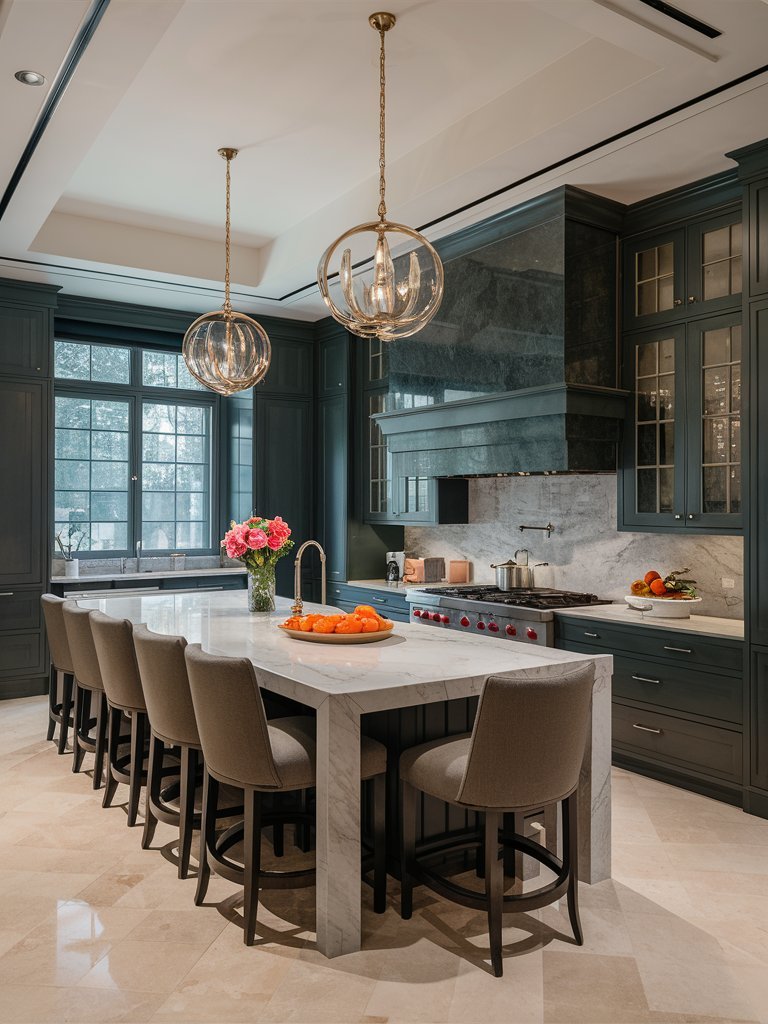 The upholstered counter stools surrounding the island blend comfort with elegance. Their muted gray tones harmonize with the overall palette, while the high backs provide ergonomic support. The seating arrangement encourages interaction, making the kitchen a hub for socializing. This choice exemplifies how luxurious kitchens can be both practical and inviting.