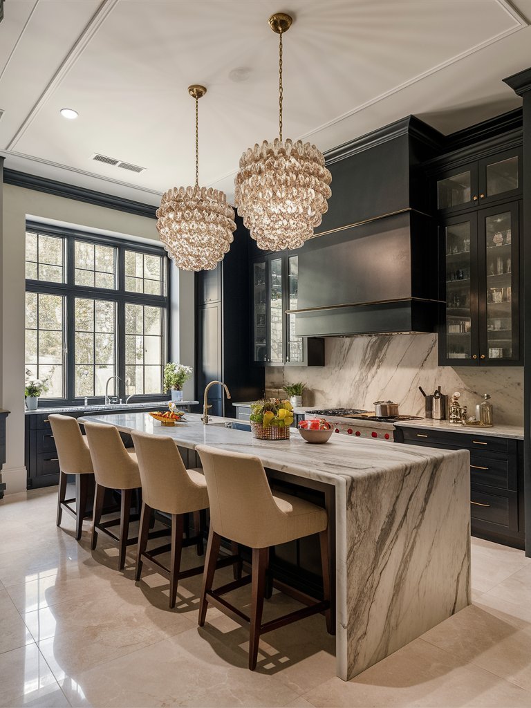 This kitchen makes an audacious design choice with the black marble island and countertops, characterized by dramatic white veining that exudes luxury and sophistication. The rich texture of the marble adds depth, making the island a striking focal point in the room. The waterfall edges give it a sleek, contemporary look while emphasizing the seamless integration of design and functionality. The black marble contrasts beautifully with the lighter floors, creating a sense of balance and ensuring the dark tones don’t overpower the space. This choice is both practical and opulent, as marble is highly durable and resistant to heat, making it ideal for a busy yet stylish kitchen.