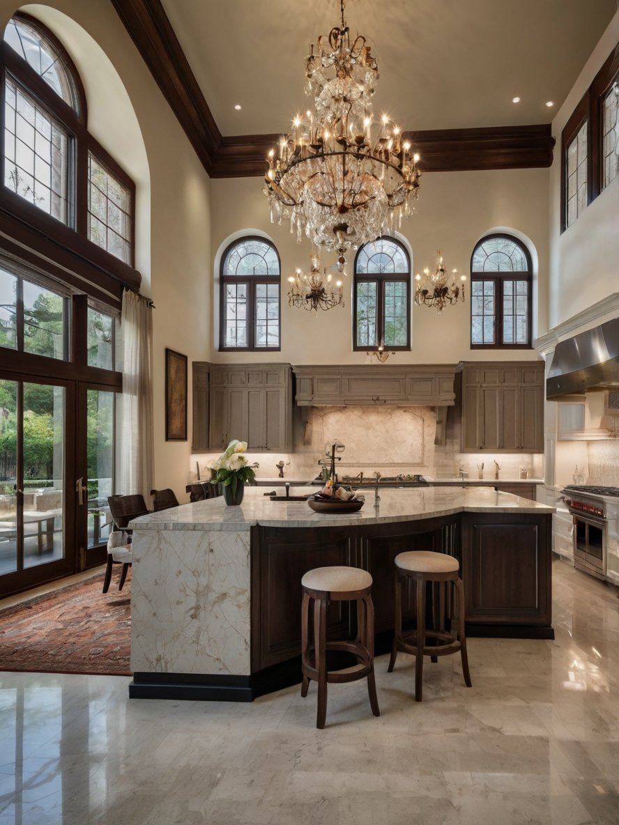 One of the most striking features of this kitchen is its towering vaulted ceiling, which adds a sense of grandeur and openness to the space. The ceiling height not only makes the room feel larger but also allows for dramatic design elements, such as the chandelier and custom range hood, to truly shine. Adding to this grandeur are the stunning arched windows, which bring in an abundance of natural light. The intricate design of the windows, with their graceful curves and segmented glass panes, adds a touch of traditional elegance while providing breathtaking views of the surrounding greenery. The sunlight filtering through these windows during the day enhances the warm tones of the kitchen, creating a space that feels both bright and serene. Together, the ceilings and windows create an awe-inspiring backdrop that sets the tone for this luxurious kitchen.