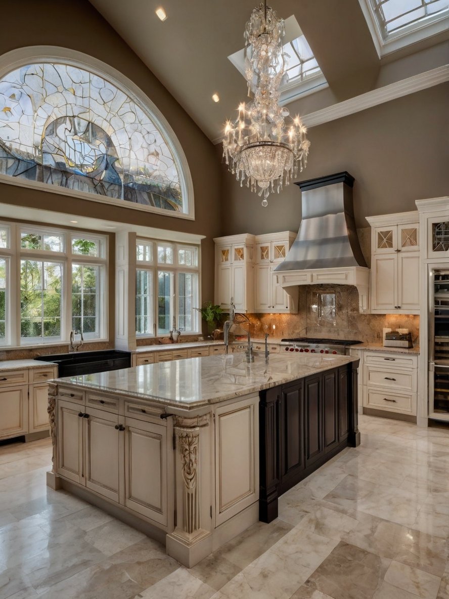 The stained glass window in this kitchen is undoubtedly a show-stopper, combining artistry and functionality. Its grand arched design draws immediate attention, while the intricate patterns and muted colors lend a touch of old-world charm to the room. Positioned strategically, it allows natural light to filter in, casting a gentle glow across the luxurious interior. The window’s artistic element breaks the monotony of traditional cabinetry, creating a balance between classic design and decorative flair. More than just a source of light, it serves as a piece of art, making the space feel both majestic and welcoming. The integration of such a unique element showcases the careful thought put into blending aesthetics with utility, making the stained glass window a signature feature that elevates the entire kitchen.
