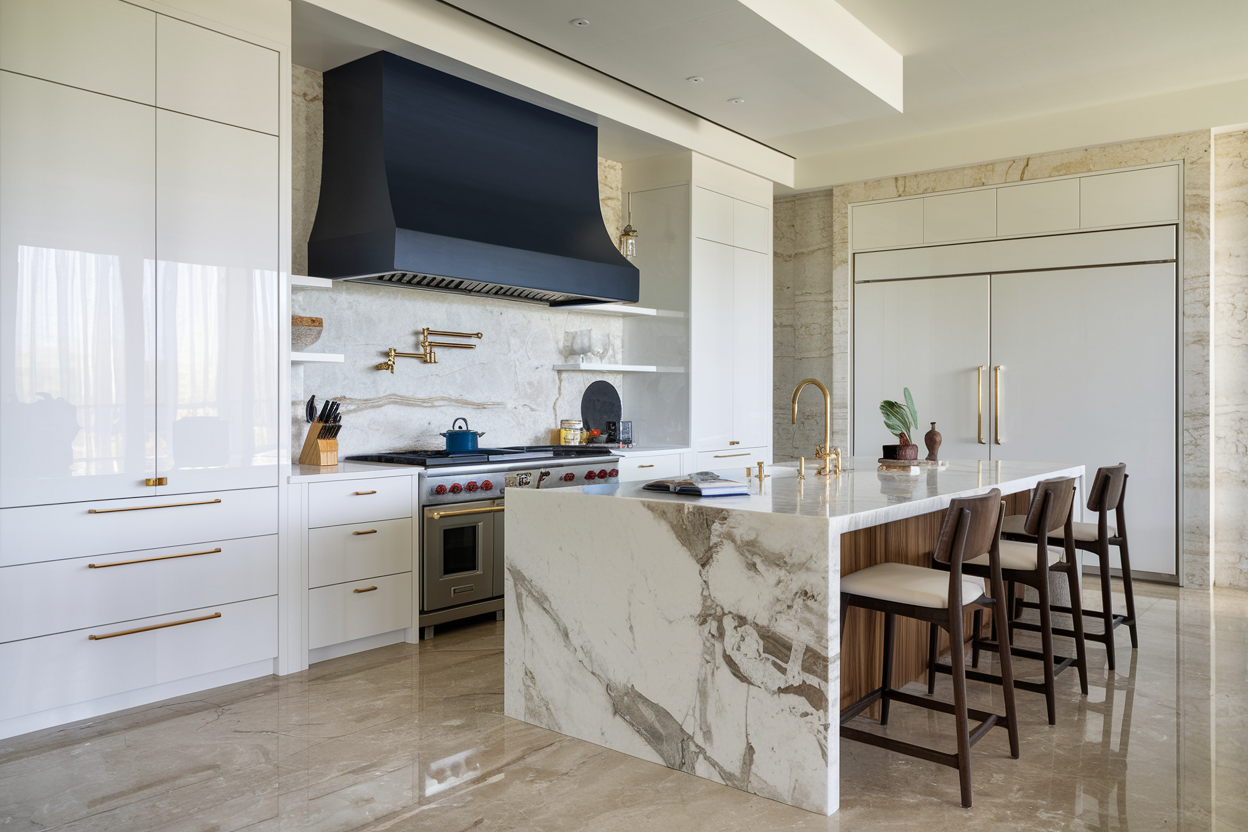 The marble range hood, accented with an elegant gold trim, is a show-stopping feature that anchors the kitchen’s luxurious aesthetic. The hood not only matches the backsplash for a seamless look but also adds a sense of grandeur with its commanding presence. The gold trim at the crown introduces a regal touch that elevates the entire space. Beyond its aesthetic appeal, the hood serves a vital function, maintaining excellent ventilation and ensuring the kitchen remains fresh and odor-free during cooking. This combination of beauty and practicality makes the hood a standout element in the design.