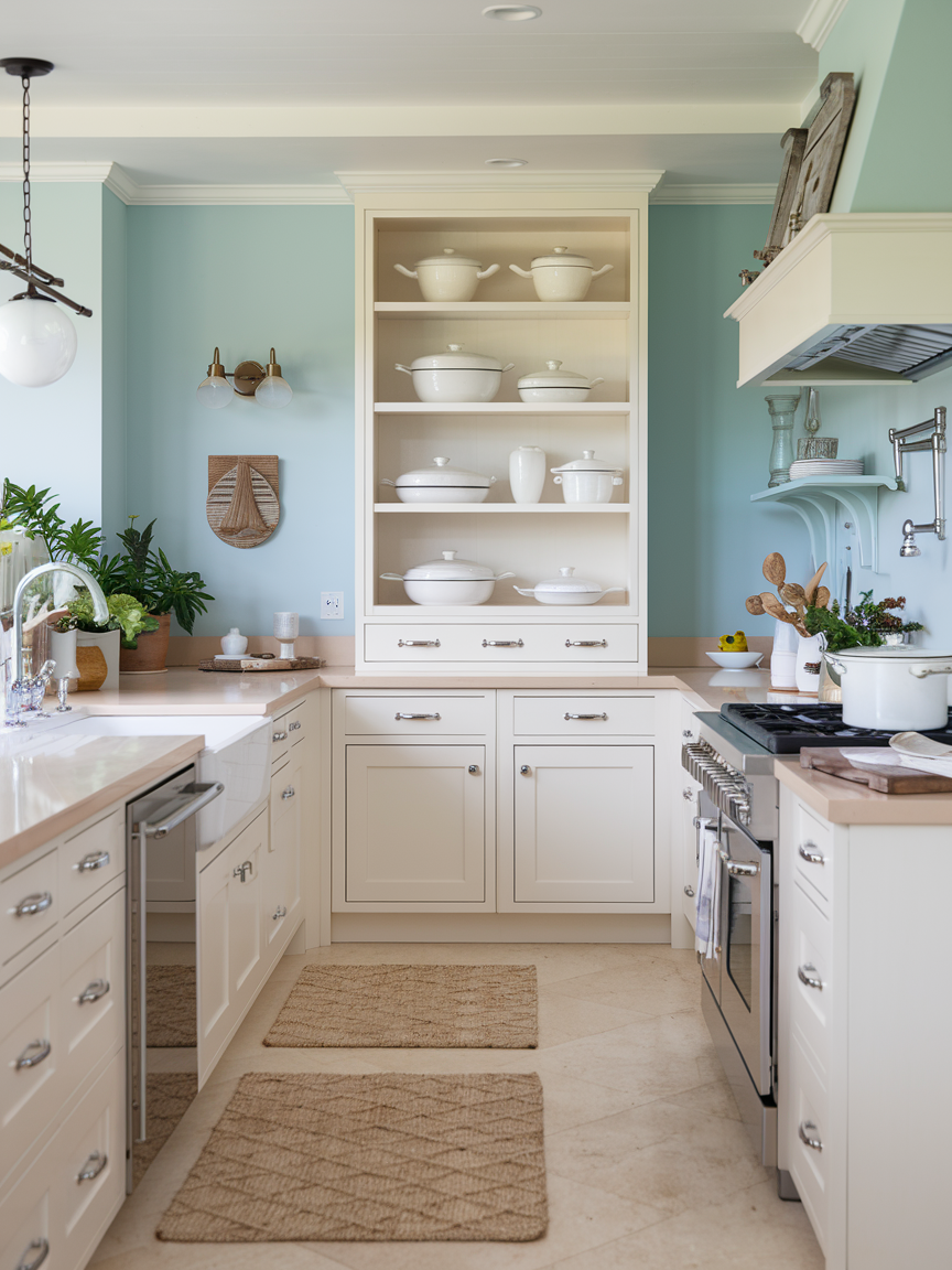 Open shelving is a signature element in modern coastal kitchens, offering both functionality and a chance to showcase thoughtfully selected décor. Instead of overcrowding shelves, focus on a curated arrangement of ceramics, glassware, woven baskets, and subtle coastal accents like shells or driftwood. The key is balance—leave breathing space between objects so the shelves feel airy rather than cluttered. Light wood or white shelves enhance brightness, while neutral-toned accessories maintain cohesion. This approach transforms everyday storage into a design feature, making your kitchen feel personal, relaxed, and effortlessly styled.