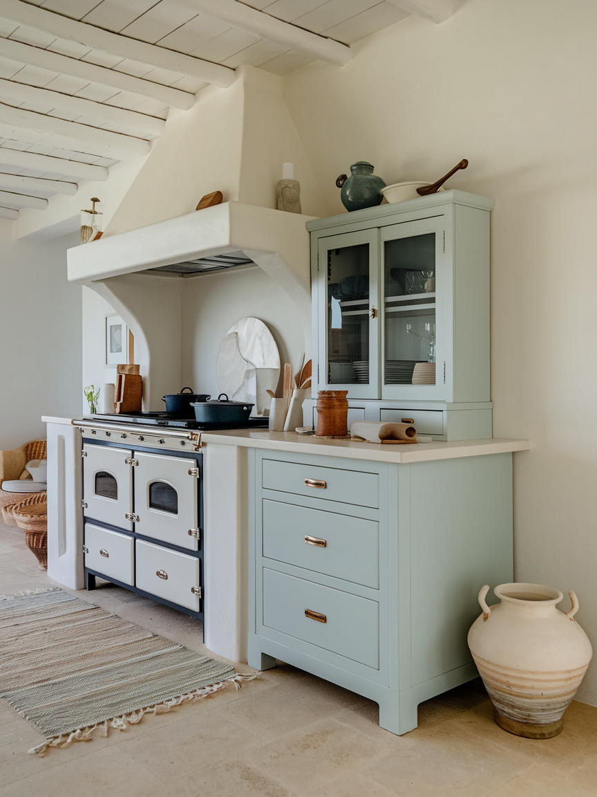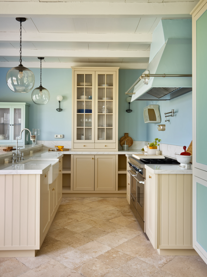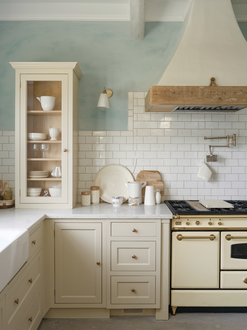Glass-front cabinets help maintain an open, airy feel while allowing you to display beautiful dishware. They prevent the kitchen from feeling heavy or closed off. Frosted or clear glass can be chosen depending on your preference for visibility. This design element adds elegance and lightness, making the space feel more expansive and refined without sacrificing storage.