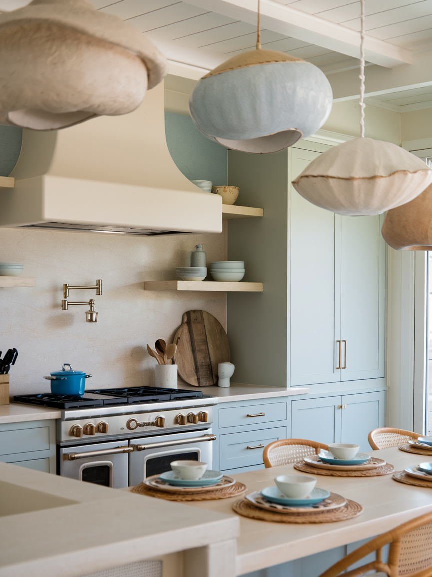 Lighting plays a major role in defining the mood of a coastal kitchen, and pendant lights with organic shapes bring softness and character to the space. Think woven rattan shades, frosted glass globes, or gently curved silhouettes that mimic natural forms. These fixtures create a warm, diffused glow that enhances the relaxed atmosphere. Positioned above an island or dining area, they act as subtle focal points without overwhelming the design. Their texture and shape add depth while maintaining the light, breezy feel that coastal interiors are known for.