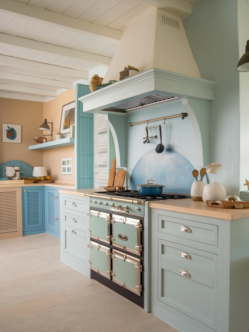 Light wood accents introduce a natural warmth that balances the crispness of white and cool coastal tones. Whether used in open shelving, kitchen islands, or trim details, woods like oak or maple bring subtle texture and organic character. The soft grain patterns add visual interest without overwhelming the design, helping the kitchen feel grounded yet still airy. These elements create a connection to nature, reinforcing the coastal theme while ensuring the space feels inviting and comfortable rather than overly minimal or sterile.