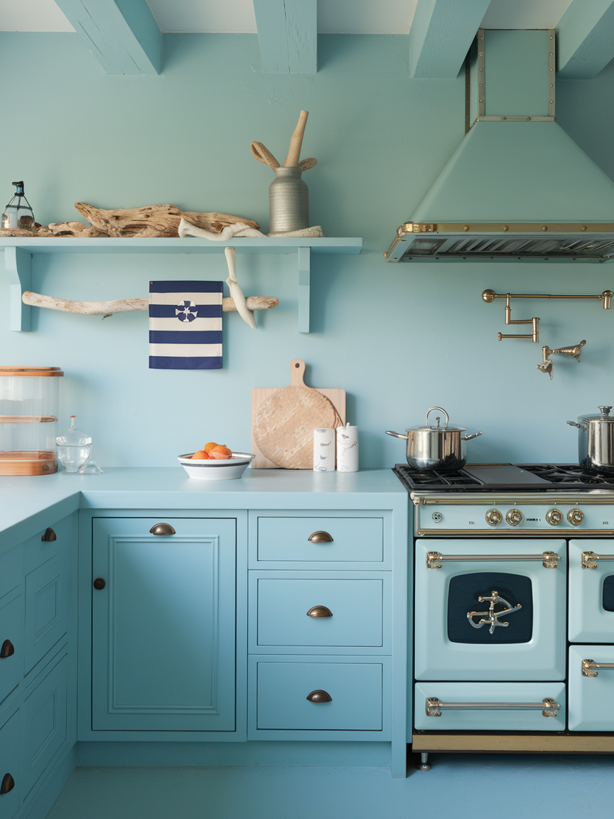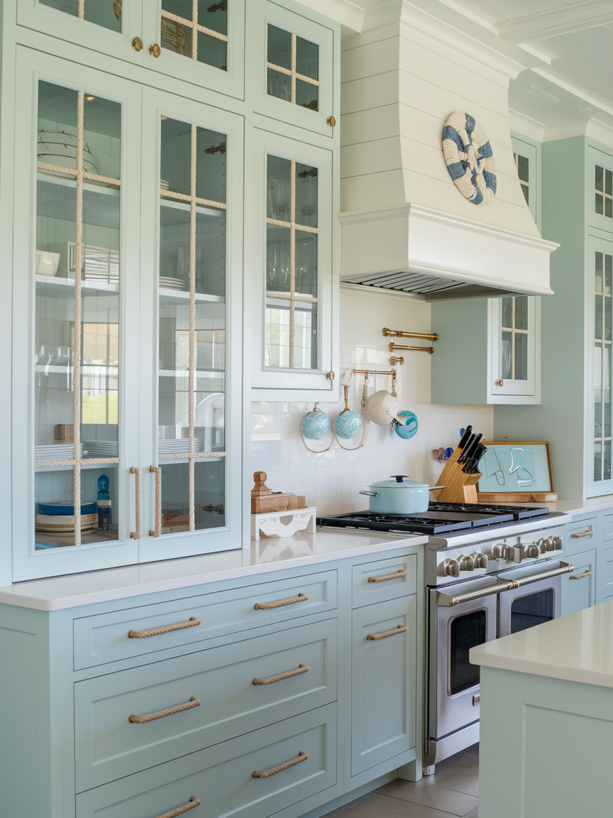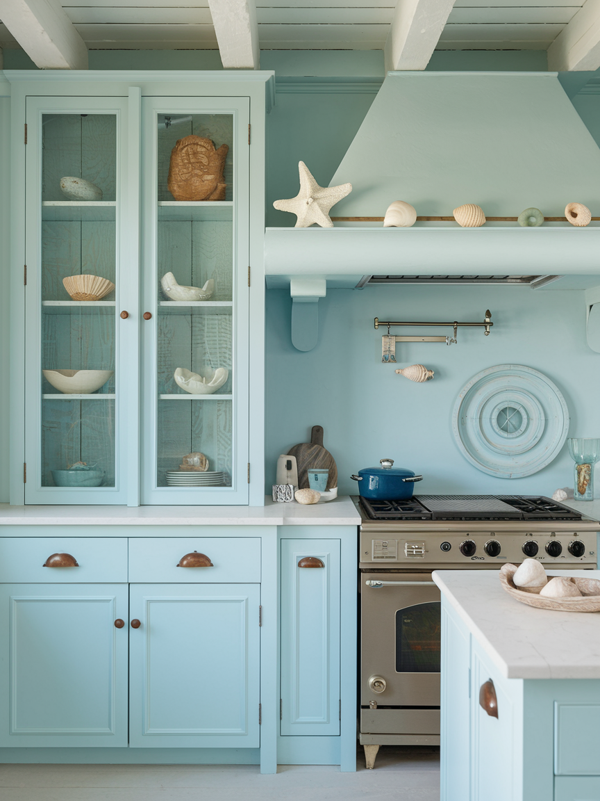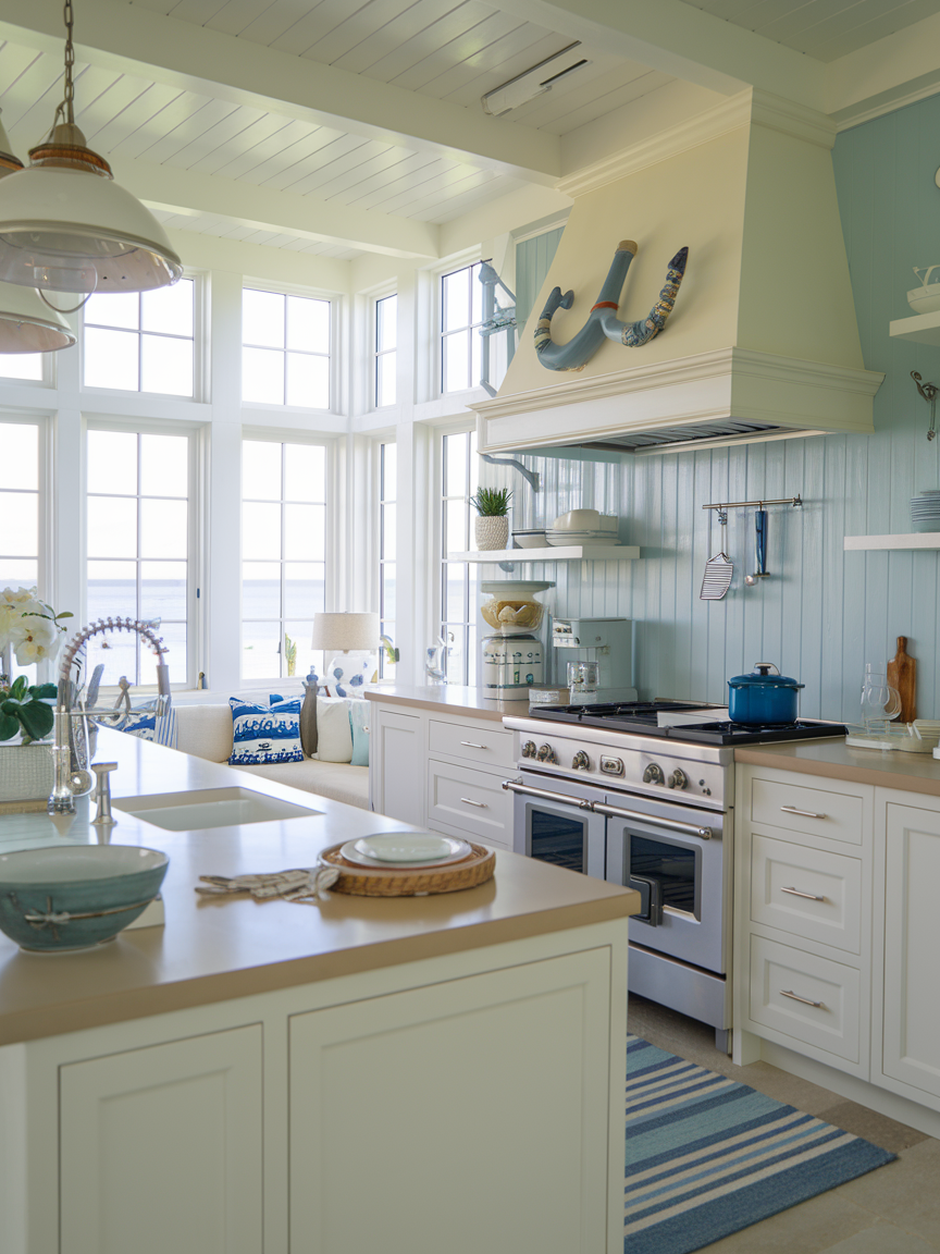 A soft blue backsplash is an elegant way to incorporate coastal color without overwhelming the space. Shades like misty blue, seafoam, or pale aqua evoke the ocean while maintaining a refined, understated look. Whether in the form of tiles, glass panels, or textured finishes, the backsplash adds a gentle layer of visual interest. It pairs beautifully with white cabinetry and natural materials, creating a harmonious palette. This subtle infusion of color keeps the kitchen feeling fresh, calm, and distinctly coastal without becoming overly themed.