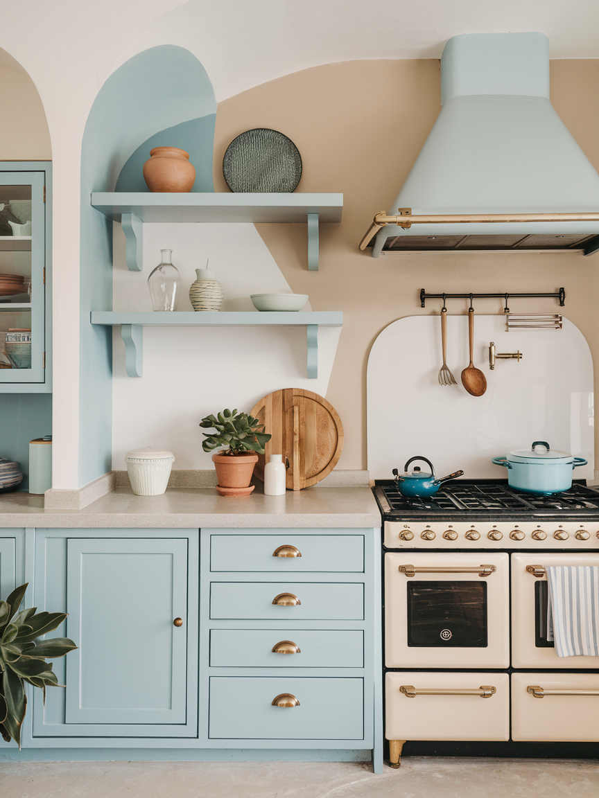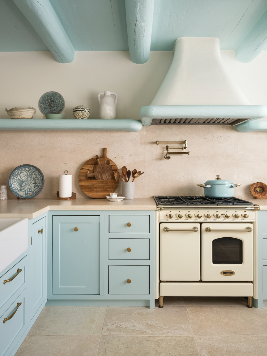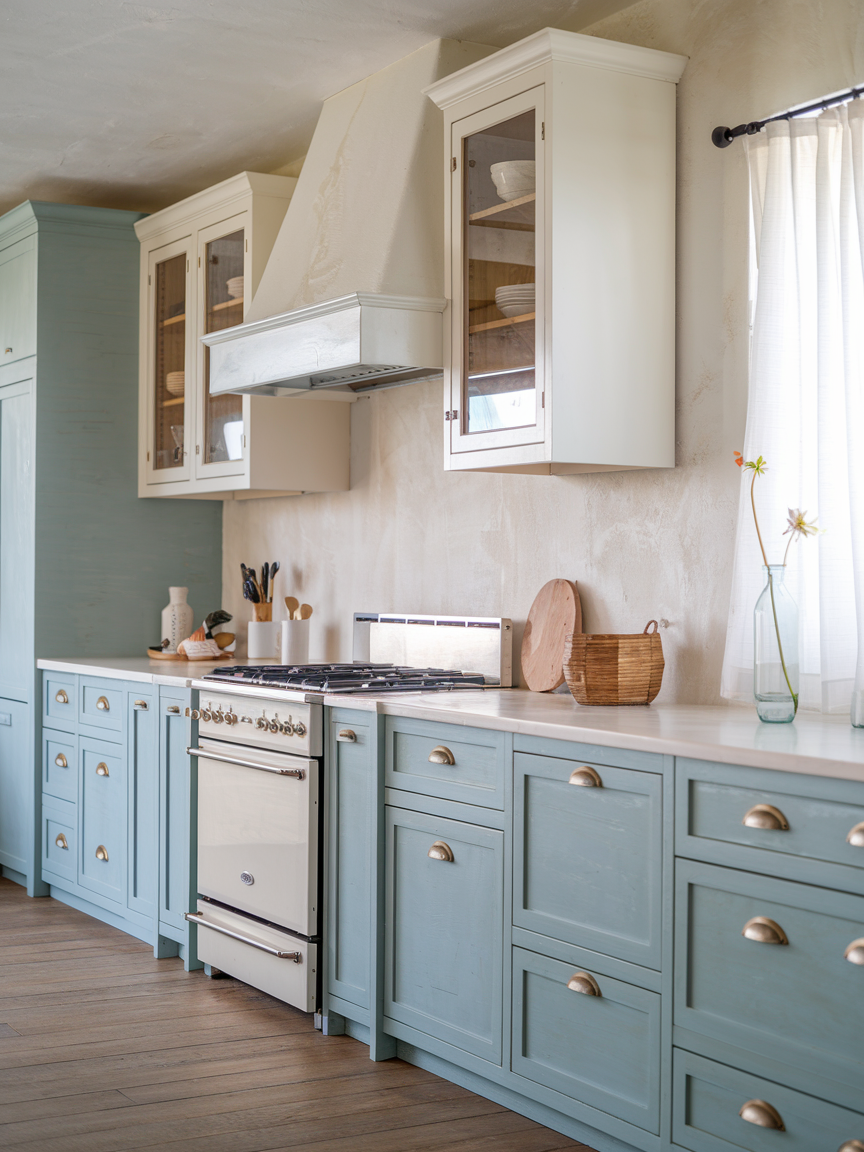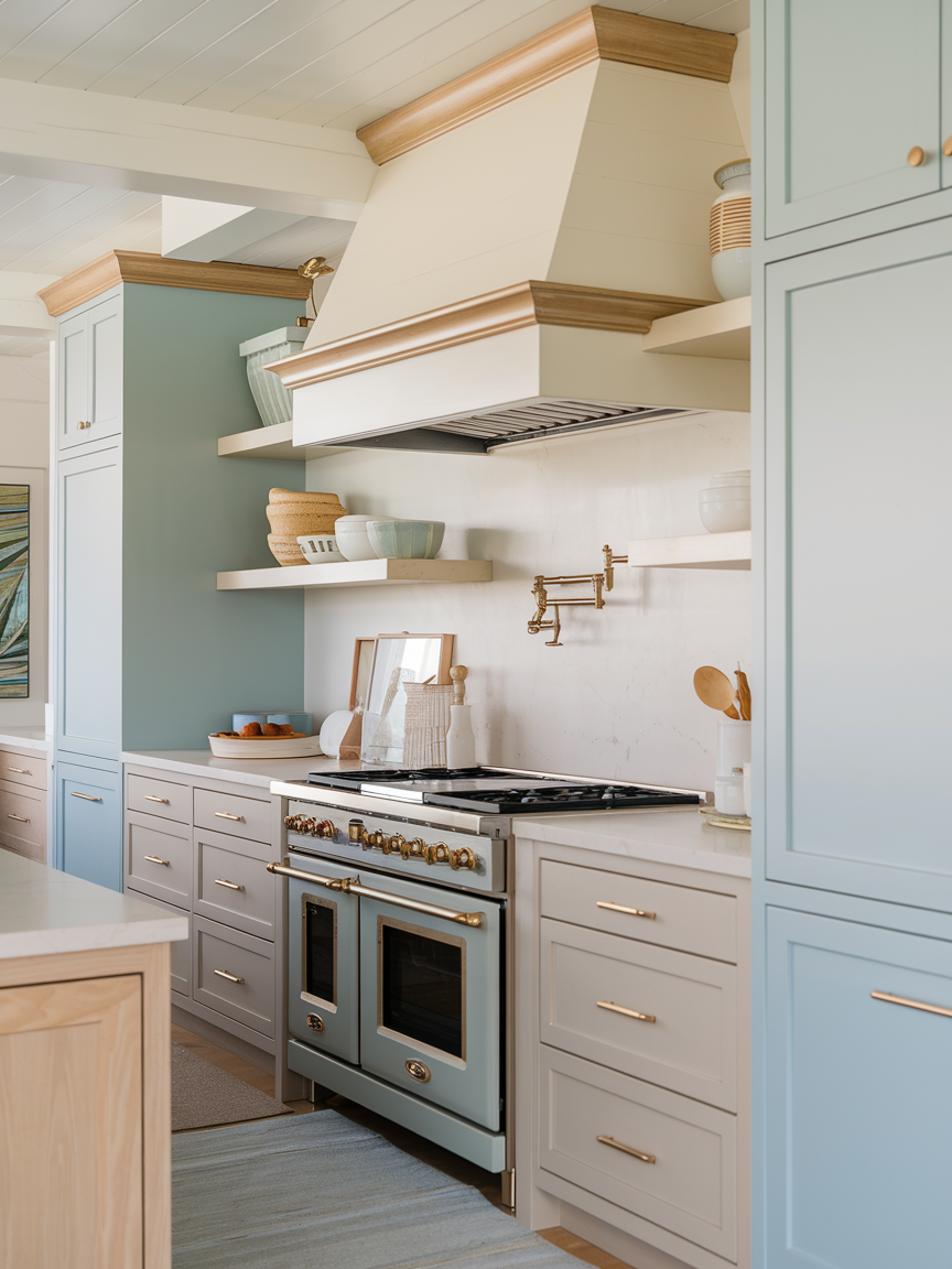 Two-tone cabinetry is a stylish way to add depth while maintaining a calm palette. Pairing white upper cabinets with soft blue, gray, or wood-toned lower cabinets creates a gentle contrast. This design technique prevents the kitchen from feeling flat while preserving its airy feel. The lighter upper cabinets keep the space open, while the darker base grounds the design. This balanced approach adds visual interest in a subtle, sophisticated way that aligns perfectly with modern coastal style.