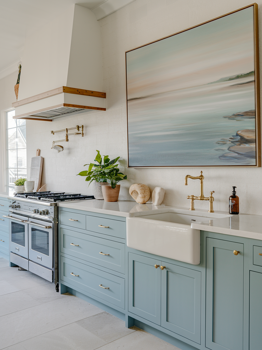 Artwork inspired by the ocean, landscapes, or abstract coastal themes adds personality without disrupting the calm aesthetic. Choose pieces with soft colors and minimal frames to maintain a refined look. Artwork can act as a focal point or simply enhance the overall atmosphere. It brings character into the space, making the kitchen feel more personal and thoughtfully designed while staying aligned with the coastal theme.