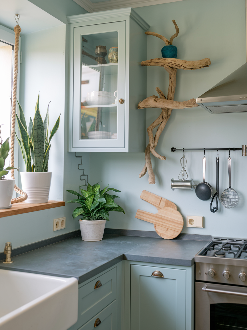 Adding greenery instantly brings life and vibrancy into a coastal kitchen. Plants like herbs, succulents, or leafy greens enhance the natural theme while improving air quality. Placing them on windowsills, shelves, or countertops adds a fresh, organic touch. The greenery contrasts beautifully with neutral tones, creating a lively yet calming environment. Plants make the kitchen feel more dynamic and connected to nature.