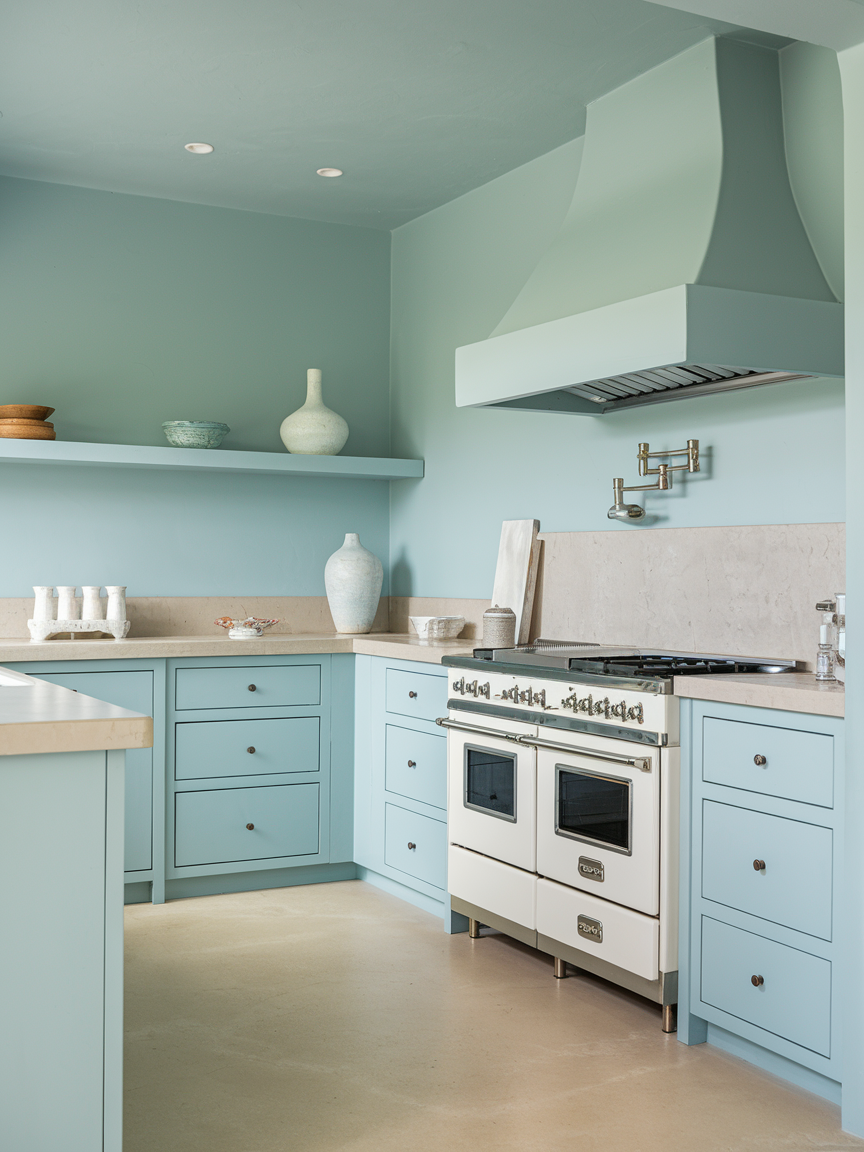 Soft blue tones evoke the tranquility of the ocean and sky, making them a perfect addition to a modern coastal kitchen. Shades like powder blue, dusty navy, or seafoam can be incorporated through cabinetry, backsplashes, or decor accents. These hues add freshness and depth while maintaining a soothing, understated look. When paired with white and natural materials, soft blues create a harmonious palette that feels both relaxing and refined, enhancing the overall sense of calm in the space.