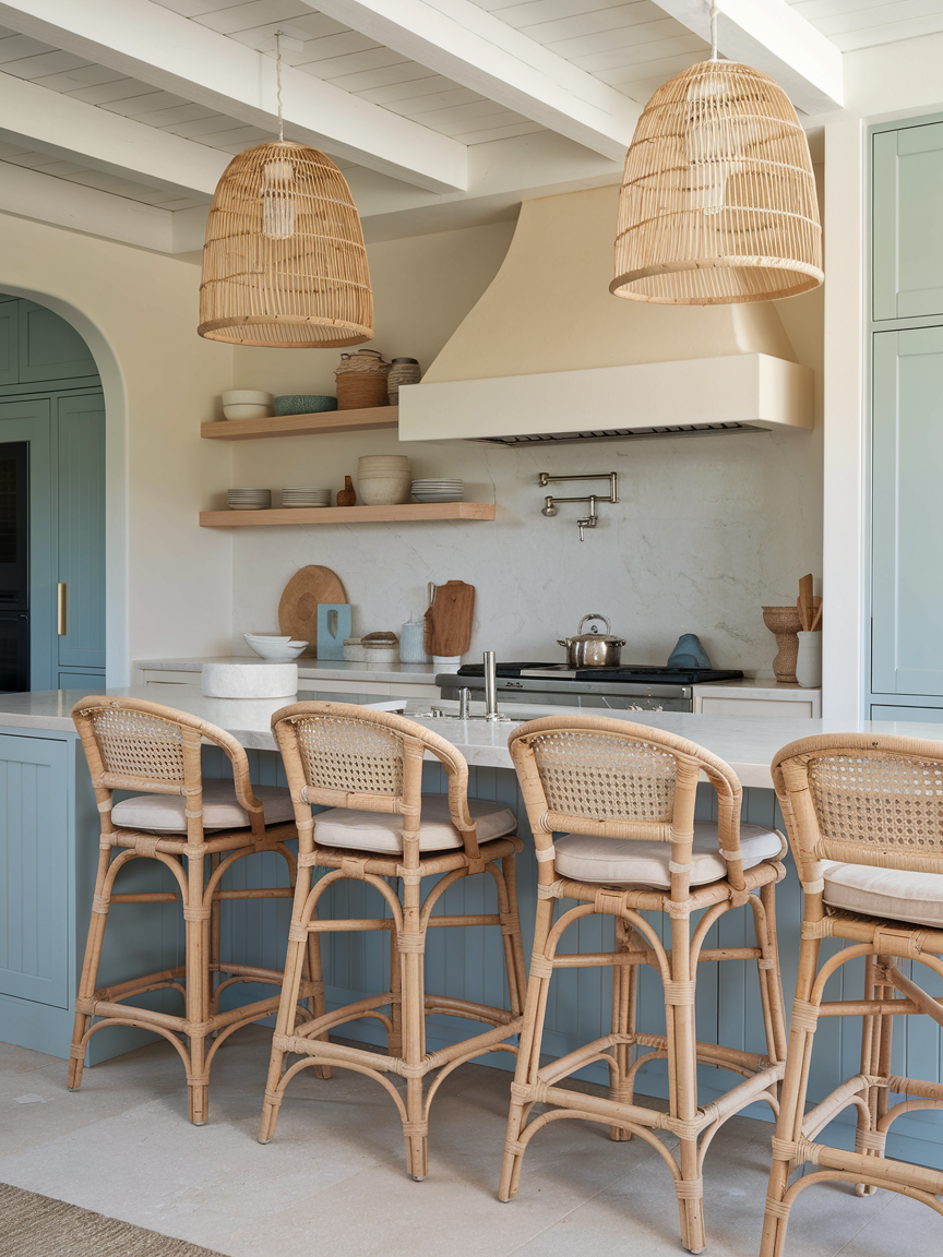 Stools crafted from rattan, wicker, or woven materials introduce texture and a relaxed coastal vibe. Their lightweight appearance prevents the space from feeling heavy, while their natural fibers add warmth and visual depth. Adding neutral cushions enhances comfort without disrupting the aesthetic. These stools create an inviting seating area that encourages casual conversations and gatherings, reinforcing the laid-back yet stylish atmosphere of a modern coastal kitchen.