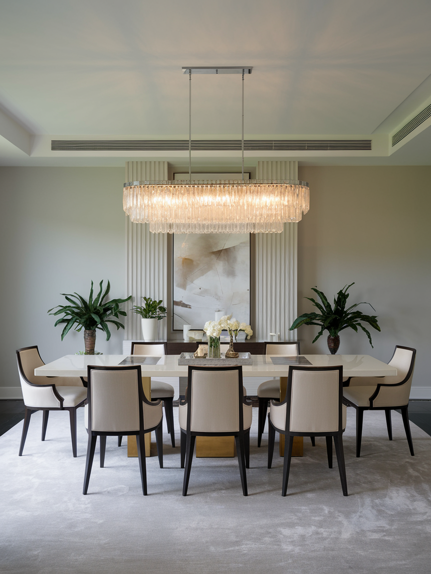 A statement crystal chandelier instantly elevates a dining room, creating a luxurious focal point that captures attention the moment someone enters the space. The sparkle of crystal refracts light beautifully, adding depth and dimension while enhancing the room’s ambiance. Choosing a modern silhouette rather than a traditional ornate design keeps the look fresh and contemporary. Pairing the chandelier with a sleek dining table and neutral walls ensures balance, preventing the room from feeling overly dramatic. The soft glow from layered lighting around the chandelier enhances warmth, making the space feel welcoming while still maintaining an air of refined sophistication.