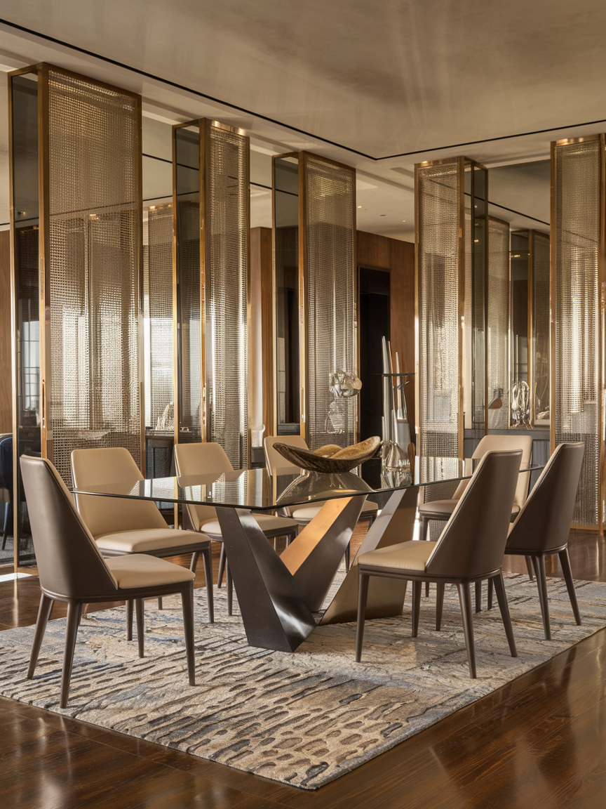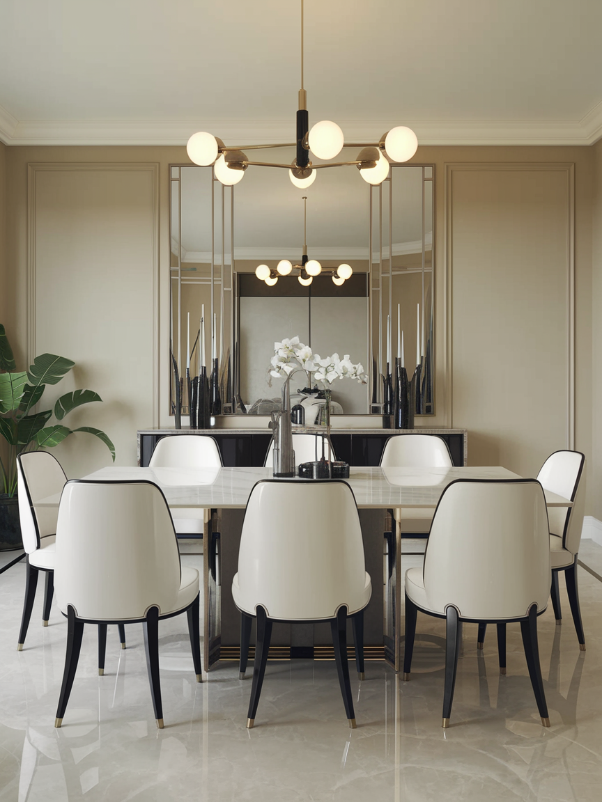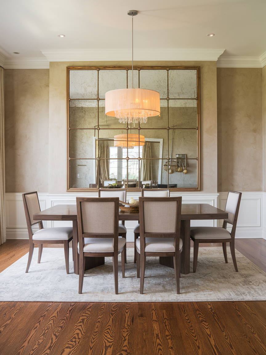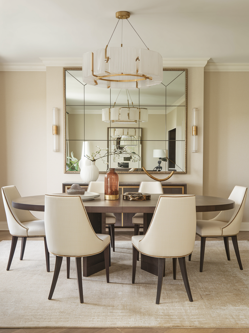 A statement mirror wall introduces grandeur and sophistication while enhancing the sense of space in a dining room. Large mirrors or a series of elegantly framed panels reflect natural light and amplify the glow of chandeliers, creating a luminous and expansive atmosphere. This reflective quality makes even compact dining areas feel more open and luxurious. Choosing frames in brushed gold, matte black, or sleek metallic finishes reinforces the modern aesthetic. Strategically placing mirrors opposite windows or light fixtures maximizes their impact and depth. Beyond functionality, mirrors add a subtle layer of glamour and architectural interest without overwhelming the space. When styled thoughtfully, a statement mirror becomes both a decorative and practical feature, contributing to an environment that feels refined, balanced, and visually captivating while maintaining a welcoming ambiance.