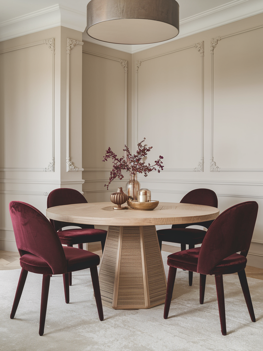 Velvet textures instantly infuse a dining room with richness, depth, and tactile luxury, transforming even a simple layout into something undeniably elegant. Incorporating velvet through upholstered dining chairs, banquettes, or accent cushions introduces a plush softness that contrasts beautifully with sleek tables and polished surfaces. Jewel tones such as emerald, navy, or deep burgundy create dramatic sophistication, while soft neutrals like champagne or dove gray maintain a lighter, airy elegance. The way velvet subtly absorbs and reflects light adds dimension, making the space feel layered and dynamic without excessive ornamentation. When paired with metallic accents, marble finishes, or warm wood elements, velvet enhances the sense of curated luxury. Beyond aesthetics, its comfort encourages guests to relax and linger, reinforcing the inviting atmosphere that is essential in a dining room designed for both style and meaningful gatherings.
