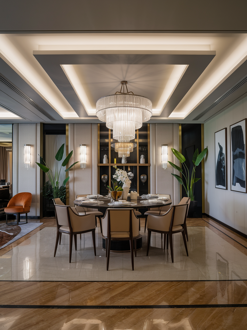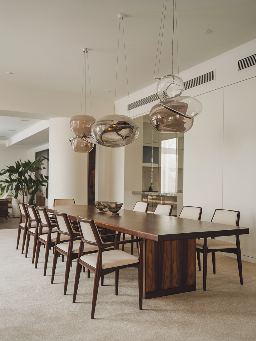 Sculptural lighting fixtures transform functional illumination into artistic expression within a modern elegant dining room. Whether crafted from glass, metal, or mixed materials, these fixtures serve as visual centerpieces that enhance architectural interest. Abstract shapes or geometric forms align beautifully with contemporary design principles, adding personality without compromising refinement. Positioned above the dining table, sculptural lighting anchors the room and draws the eye upward, emphasizing ceiling height. Warm lighting tones ensure the space retains its welcoming atmosphere. By blending creativity with practicality, sculptural fixtures elevate the dining experience, making the room feel curated and thoughtfully designed while maintaining the sophistication that defines modern luxury.