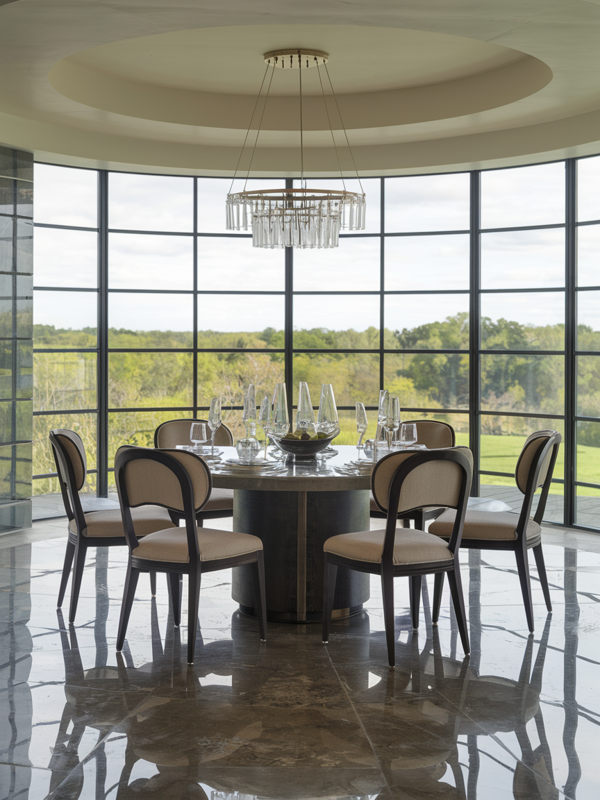 A round dining table fosters intimacy and connection, making it a perfect choice for a modern elegant dining room that prioritizes both beauty and comfort. The absence of sharp corners softens the visual flow of the space, creating a more organic and harmonious layout. In luxurious materials such as marble, dark-stained wood, or polished stone, a round table becomes a refined centerpiece that feels balanced and welcoming. Its symmetrical design encourages conversation, allowing every guest to feel equally included. Pairing the table with curved upholstered chairs enhances the sense of cohesion and comfort. A statement chandelier centered above the table further emphasizes its graceful geometry. This thoughtful arrangement blends architectural sophistication with social warmth, resulting in a dining environment that feels polished yet genuinely inviting for both everyday meals and special celebrations.