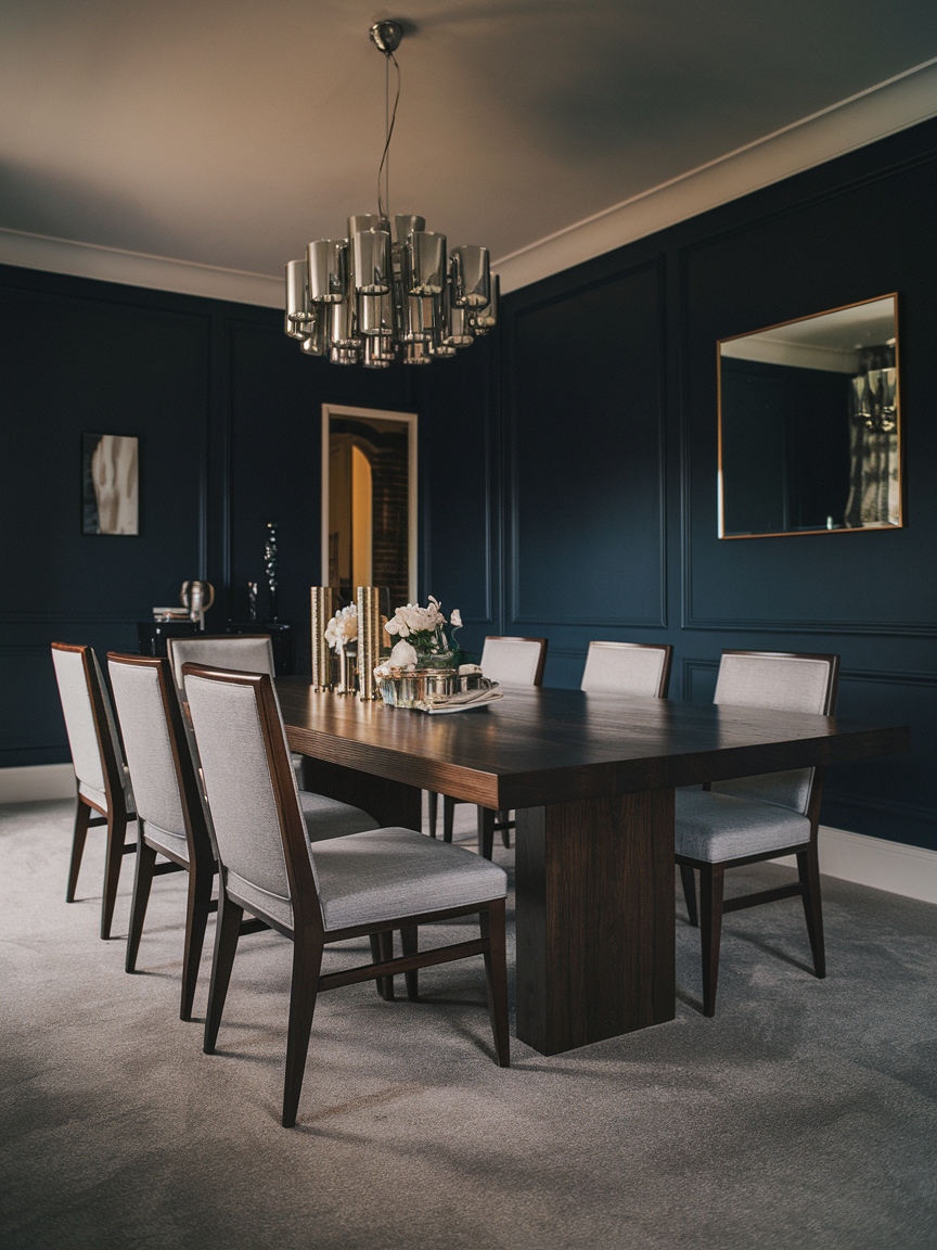 Dark moody walls bring depth, drama, and intimacy to a modern elegant dining room, creating a sophisticated atmosphere that feels both bold and inviting. Shades such as charcoal gray, deep navy, forest green, or rich espresso add a cocoon-like quality that enhances evening gatherings. When paired with lighter furniture, metallic accents, or marble surfaces, the contrast feels striking yet harmonious. The key to preventing the space from feeling heavy lies in balanced lighting and reflective elements such as mirrors or polished finishes. Soft textiles and warm-toned décor further soften the intensity of dark hues. This interplay between shadow and light creates an environment that feels layered and luxurious. Moody walls elevate the dining experience, turning the room into an intimate setting perfect for memorable conversations and elegant dinner parties.