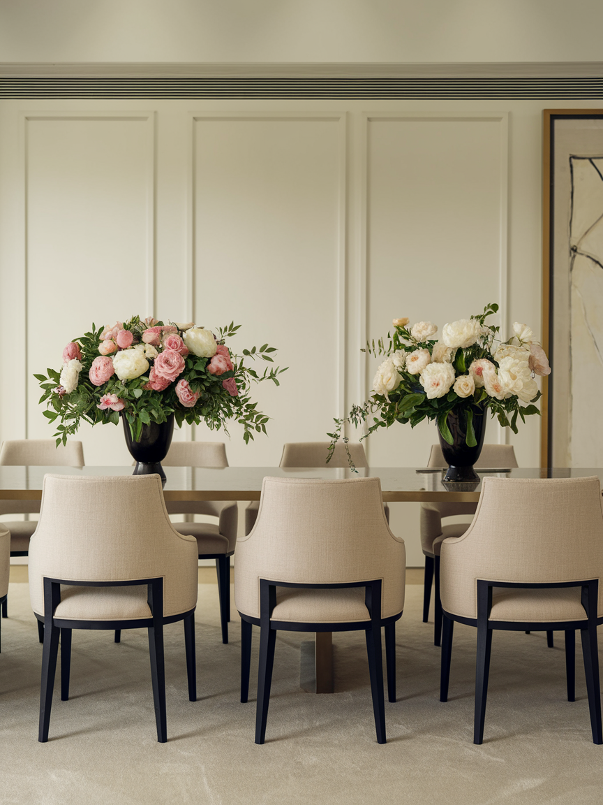 Fresh floral arrangements introduce natural beauty and softness into a modern elegant dining room. Carefully selected blooms in cohesive colors enhance the room’s palette without overwhelming it. Placed in sculptural vases, flowers create a refined focal point that feels lively and inviting. Seasonal arrangements keep the space feeling fresh and thoughtfully curated, completing the luxurious yet welcoming atmosphere.