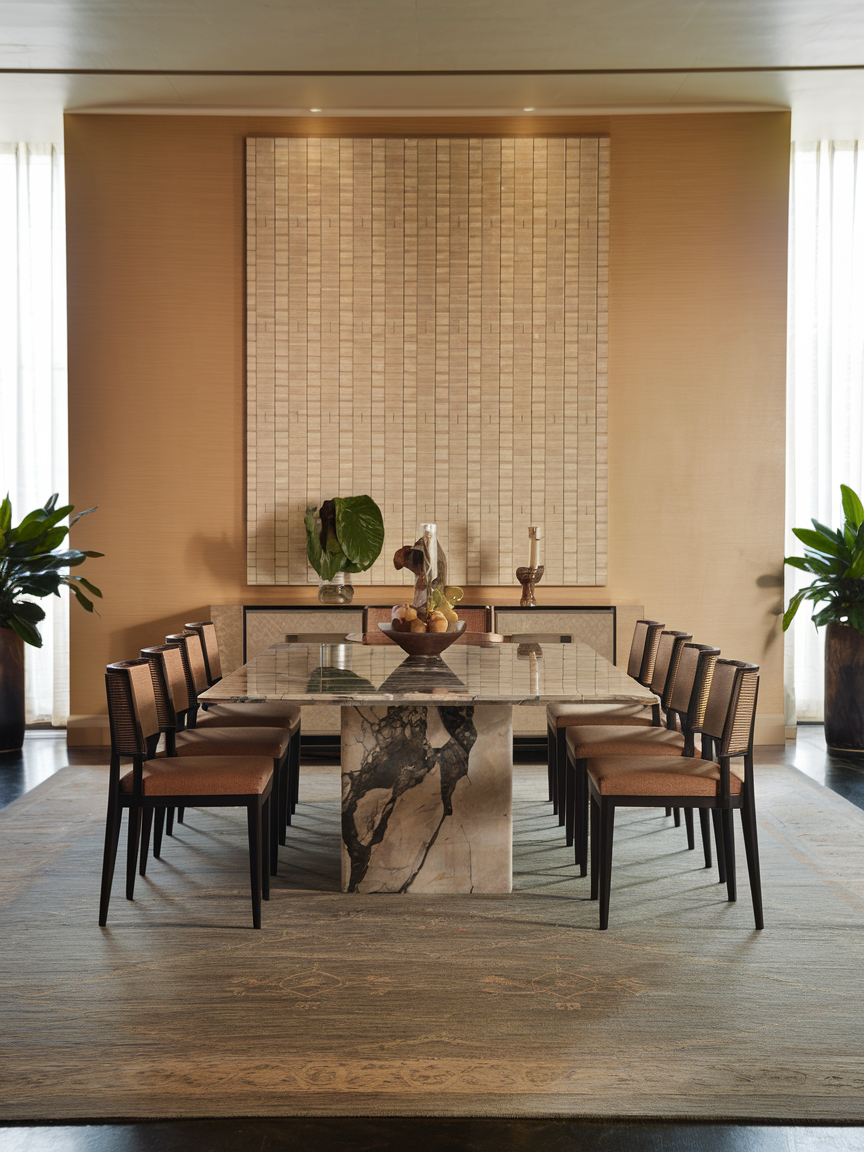 Texture and contrast play an essential role in achieving this aesthetic. Polished marble surfaces, rich wood tones, plush upholstered chairs, and metallic accents add depth and visual interest without overwhelming the room. A cohesive color palette, layered lighting, and carefully chosen centerpieces help transform everyday meals into elevated experiences.