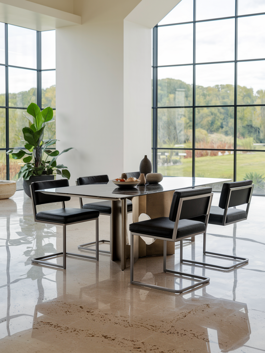 A sculptural dining table base transforms a functional piece into a work of art. Whether crafted from metal, wood, or stone, a unique base design adds personality and architectural interest. Keeping the tabletop simple ensures the base remains the focal point without creating visual clutter. This balance between artistry and restraint embodies modern elegance. Paired with streamlined chairs and subtle décor, the sculptural element enhances sophistication while maintaining harmony. The result is a dining room that feels thoughtfully curated and undeniably luxurious.