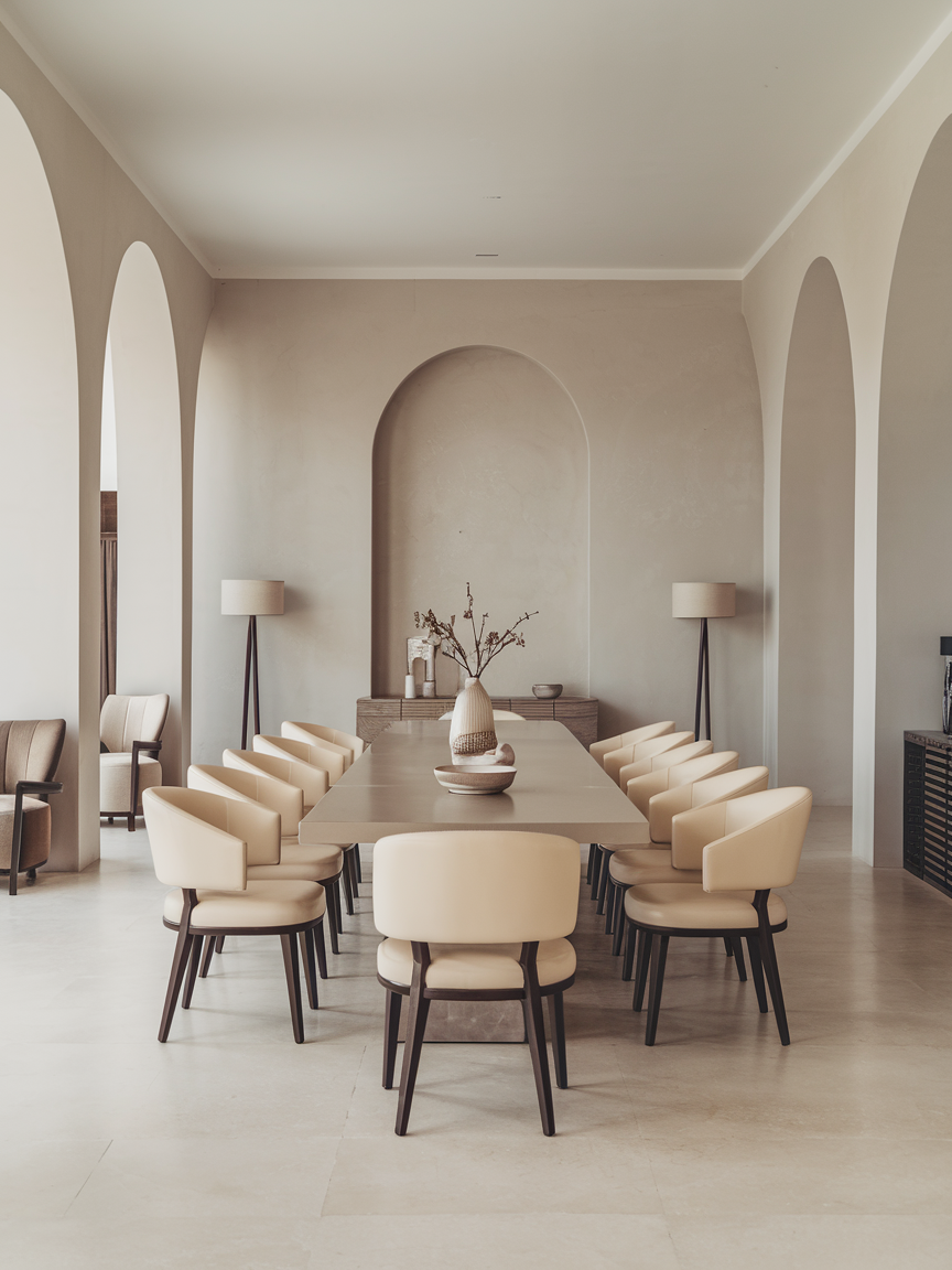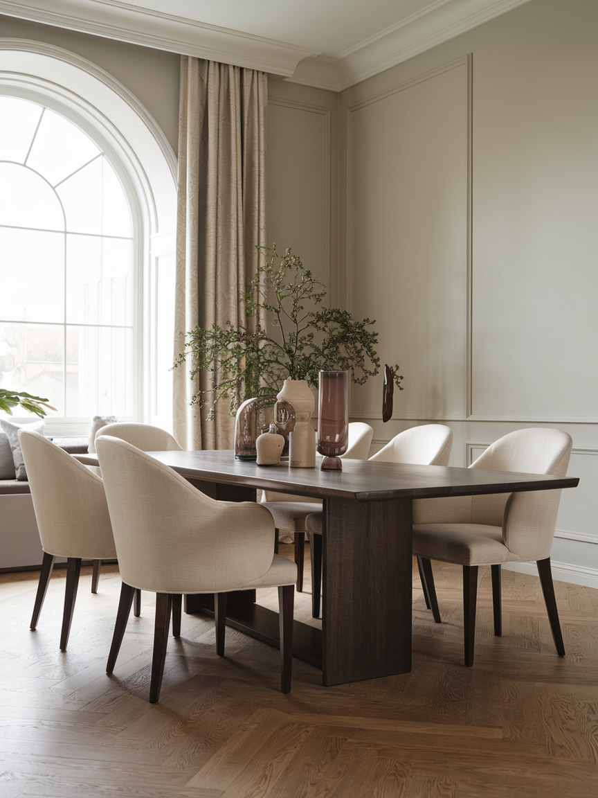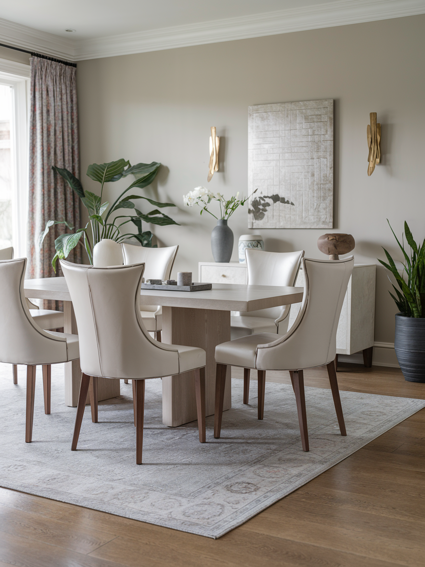 Soft neutral upholstered chairs bring comfort and understated glamour to a modern elegant dining room. Fabrics such as velvet, linen, or boucle add tactile richness without overwhelming the design. Neutral shades like beige, taupe, or soft gray create harmony and versatility, allowing other design elements to shine. Curved chair backs or subtle tufting can introduce gentle sophistication while maintaining clean lines. The plush seating encourages guests to linger, enhancing the welcoming atmosphere. This thoughtful combination of texture and tone ensures the room feels both luxurious and approachable.