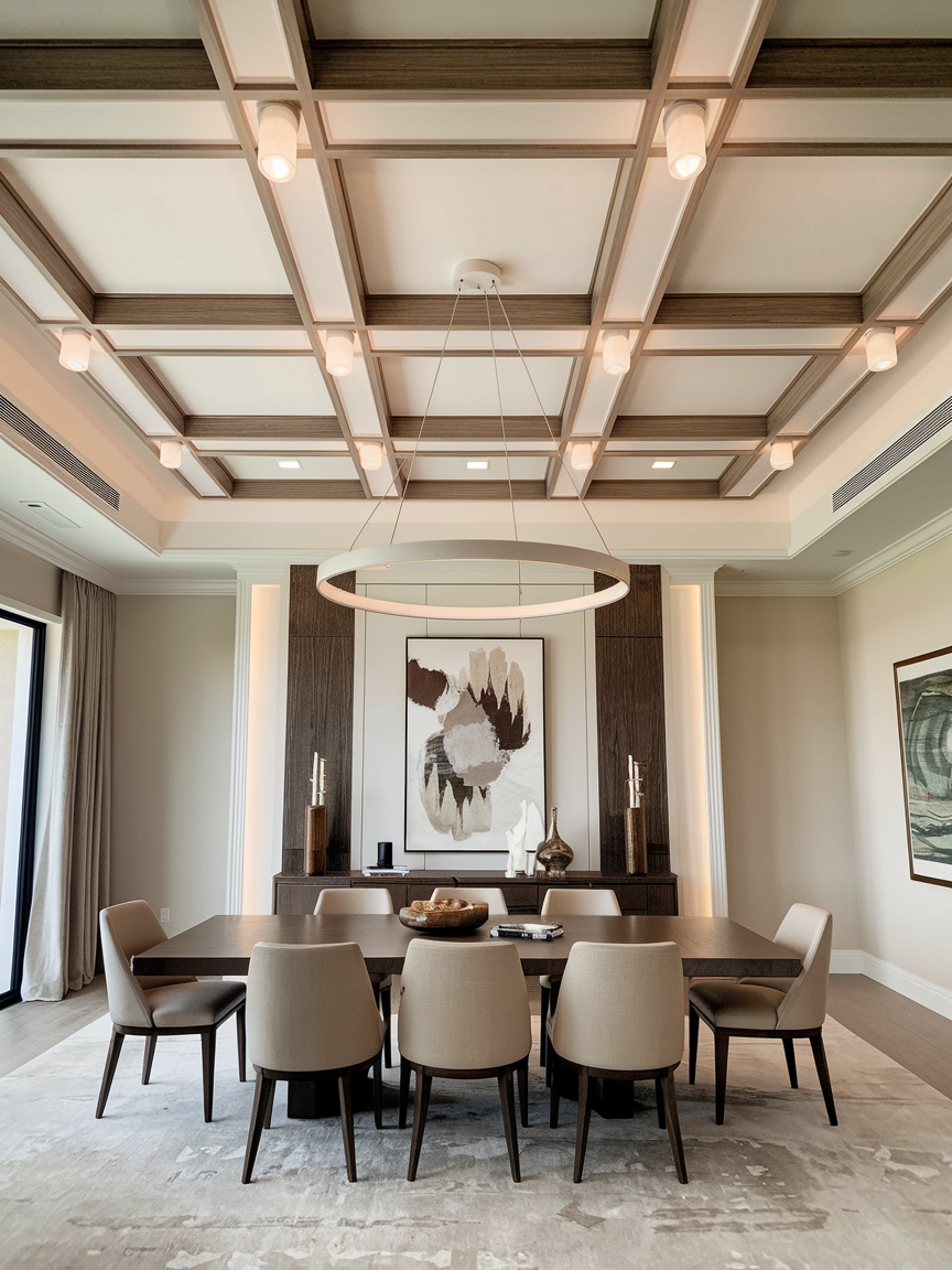 Architectural ceiling details elevate a dining room by drawing attention upward and adding dimension. Coffered ceilings, recessed panels, or subtle molding create depth and a sense of grandeur. Painted in complementary tones, these details enhance elegance without overwhelming the space. Paired with a central chandelier, the ceiling features emphasize vertical height and sophistication. This architectural interest contributes to a refined and well-considered design that feels luxurious and complete.