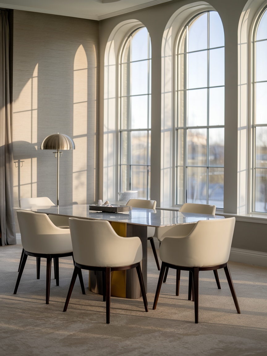 Large windows flood the dining room with natural light, enhancing colors, textures, and finishes. Sunlight creates warmth and highlights materials such as marble, wood, and metallic accents. Simple window treatments maintain openness while providing privacy. The connection to the outdoors adds freshness and vibrancy, making the space feel alive and welcoming.