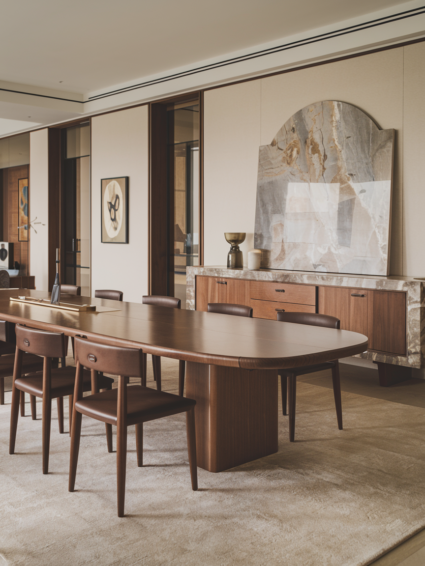 A statement sideboard serves as both functional storage and a sophisticated design feature. Crafted from rich wood, lacquer, or stone, it complements the dining table while providing practical organization. Styling the top with minimal décor, artwork, or lighting enhances elegance. This piece anchors the room and reinforces its refined aesthetic.