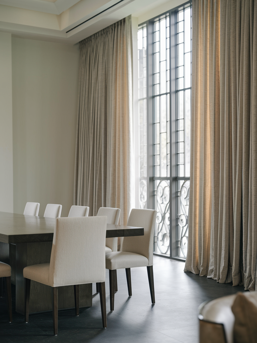 Floor-to-ceiling drapery adds height and drama while softening the architectural lines of a dining room. Choosing flowing fabrics in neutral or muted tones enhances elegance without distracting from the overall design. The vertical lines create an illusion of taller ceilings, contributing to a grand and airy feel. Sheer layers paired with heavier panels allow for adjustable lighting and privacy. This layering technique adds depth and refinement while maintaining warmth. Drapery not only frames windows beautifully but also contributes to a cohesive and luxurious atmosphere that feels both intimate and impressive.