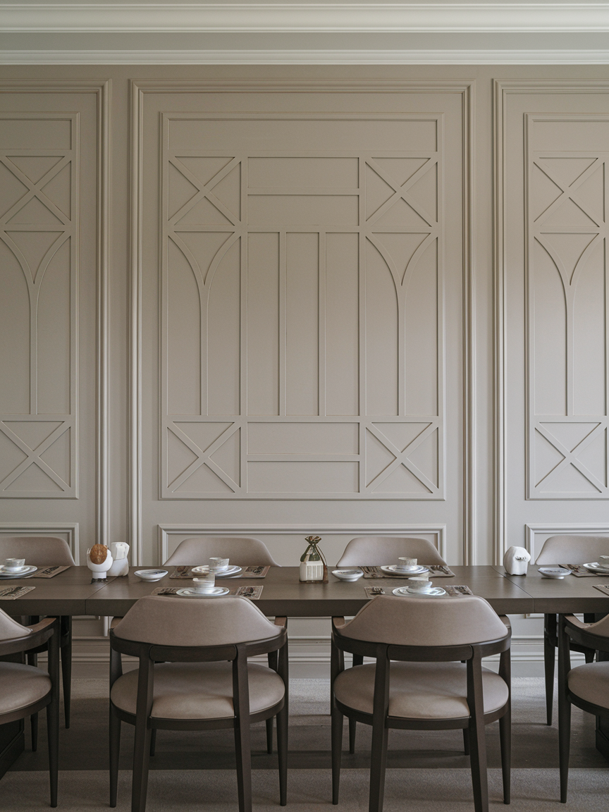 Modern wall paneling adds architectural texture and understated drama. Clean-lined molding or geometric panels create visual interest while maintaining sophistication. Painted in soft neutral tones, paneling enhances depth without disrupting harmony. This feature adds a tailored and custom look to the space, elevating its perceived luxury. When paired with minimalist décor and elegant lighting, wall paneling reinforces a polished and timeless design narrative.
