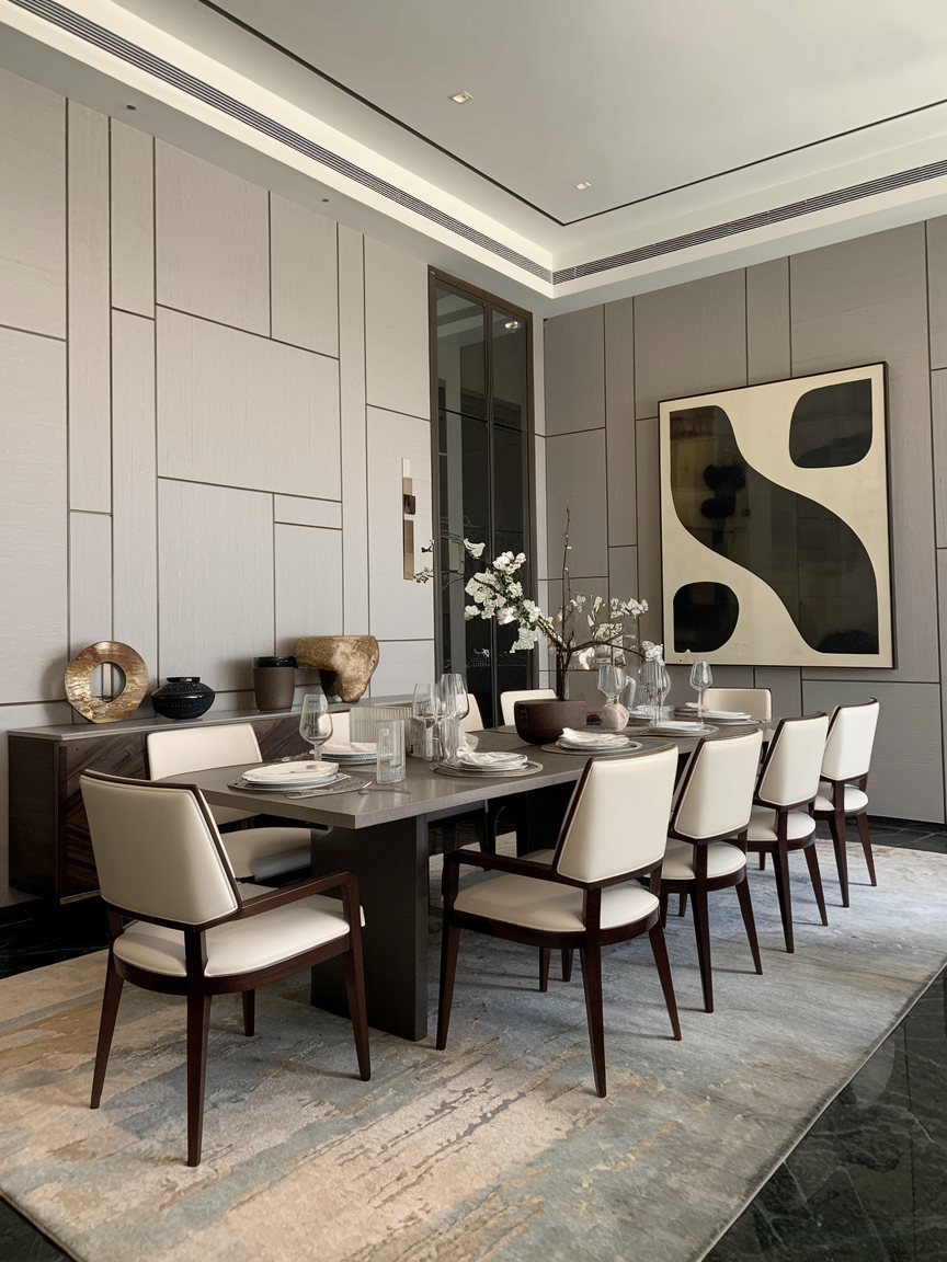 Oversized abstract artwork serves as a striking focal point in a modern elegant dining room. Selecting pieces in cohesive colors ensures the art complements the room rather than overwhelms it. Large-scale art introduces personality and visual intrigue while maintaining a curated feel. The simplicity of abstract forms aligns beautifully with modern design principles. Positioned thoughtfully, artwork enhances balance and sophistication, creating a gallery-inspired atmosphere that feels elevated yet welcoming.