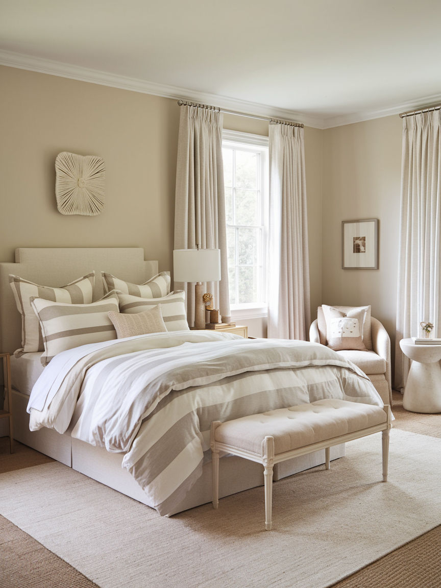 A neutral color palette remains one of the most timeless and trendy ways to refresh a bedroom. Shades like warm beige, soft taupe, creamy white, and light gray create a calm and sophisticated foundation that makes the space feel airy and relaxing. These tones also reflect natural light beautifully, helping the room feel larger and more open. To prevent the look from feeling flat, layer different textures such as linen bedding, knit throws, and woven rugs. Neutral bedrooms also make it easy to swap seasonal accents like pillows or decor without redesigning the entire space. This approach is perfect for anyone who wants a serene retreat that feels modern, elegant, and effortlessly cohesive.