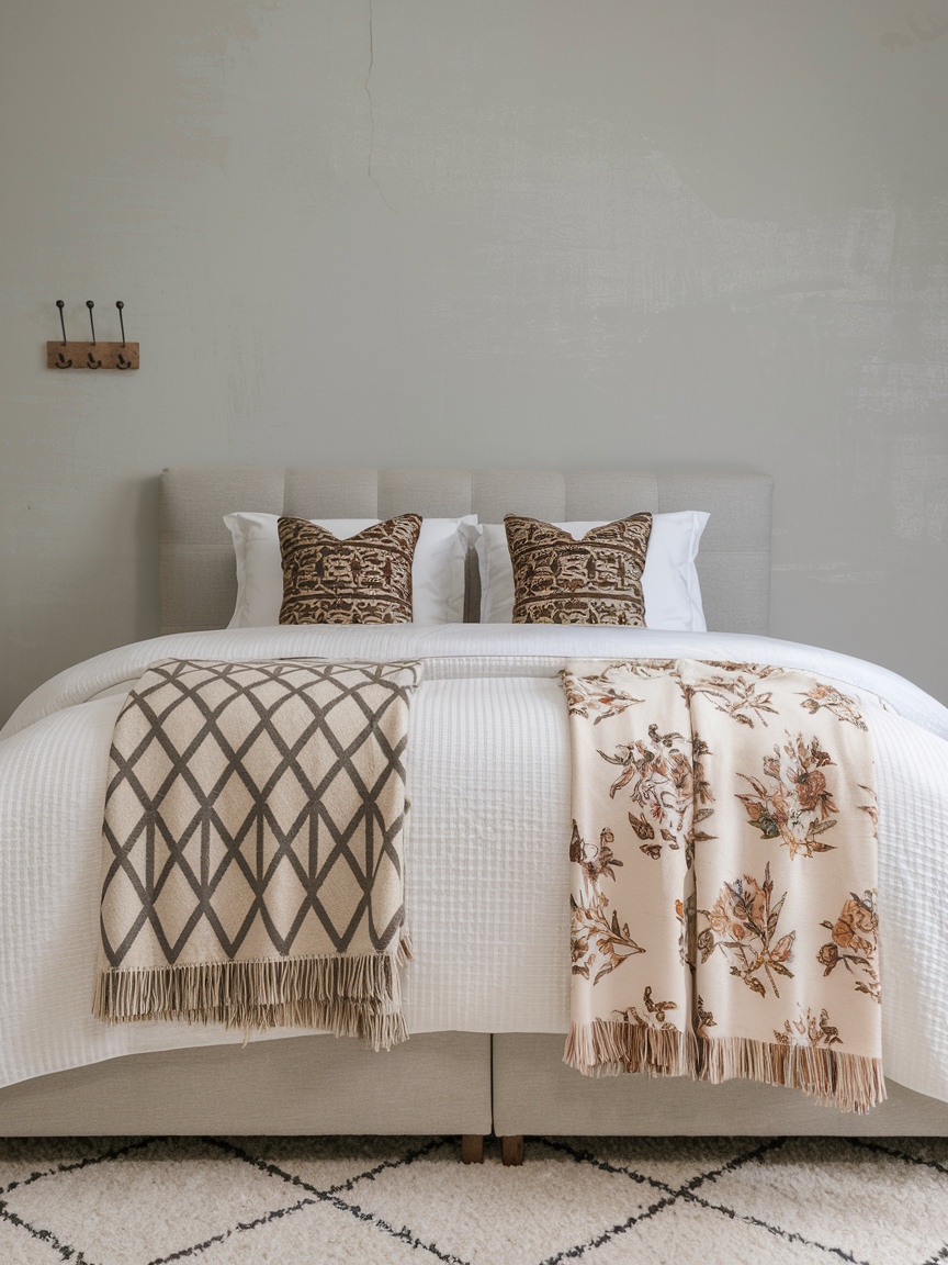 A decorative throw blanket is a small detail that can make a big impact on bedroom styling. Draping a textured or patterned throw across the bed adds warmth, color, and dimension. Choose materials like chunky knit, cotton, or faux fur depending on the season and desired aesthetic. Coordinating the throw with pillows or other accents helps create a cohesive look. This simple addition also makes the bed feel more inviting and comfortable for relaxing during the day. Swapping throws seasonally is an easy way to refresh your bedroom without investing in new furniture or major decor changes.